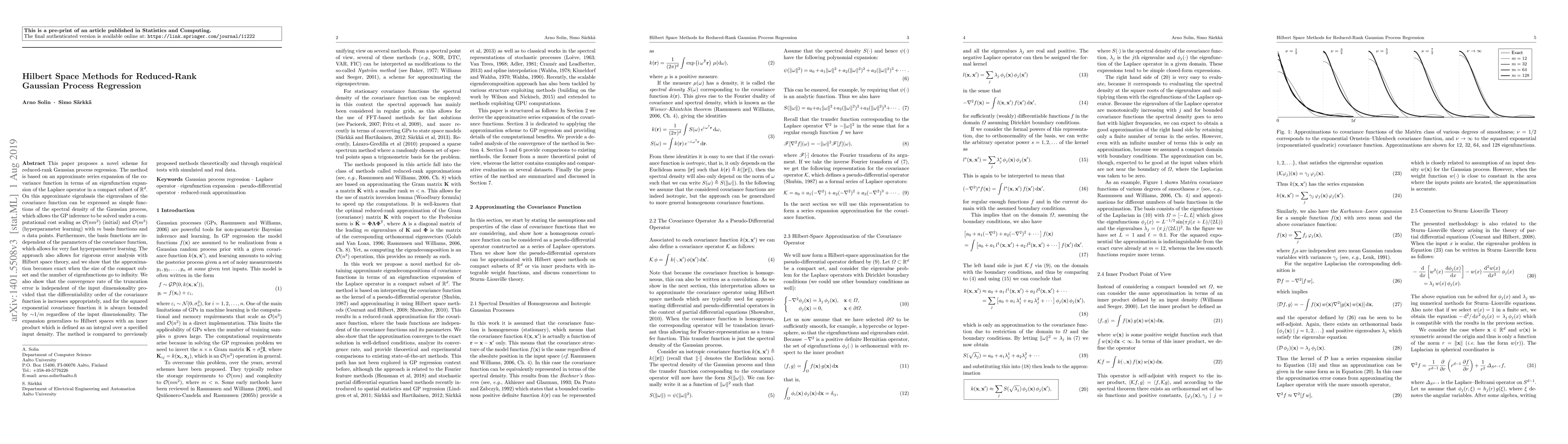 This paper introduces a reduced-rank Gaussian process regression method using Hilbert space techniques, achieving computational efficiency and fast hyperparameter learning. The method's approximation converges to exactness as the basis size increases, with error rates independent of input dimensionality.