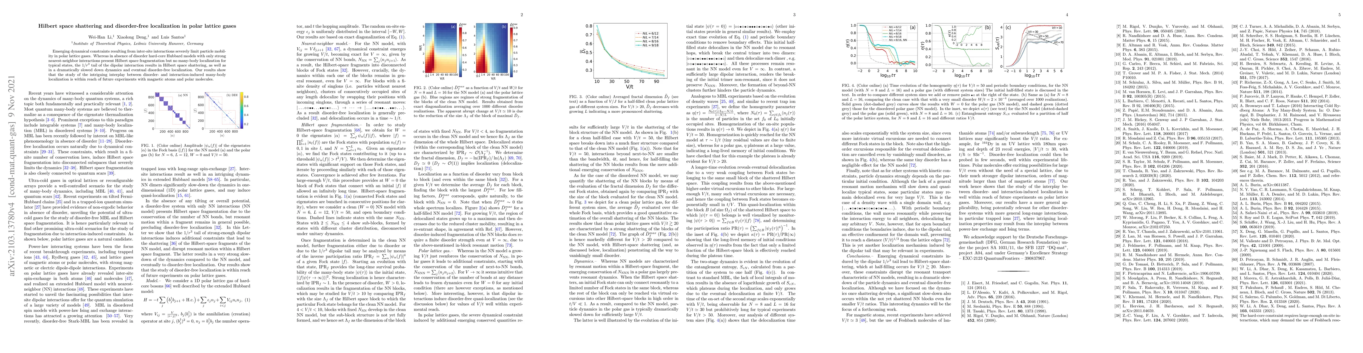 This paper explores how dipolar interactions in polar lattice gases lead to Hilbert space shattering and disorder-free localization, contrasting the dynamics of systems with strong nearest-neighbor interactions. Future experiments with magnetic atoms and polar molecules may reveal the interplay between disorder and interaction-induced many-body localization.