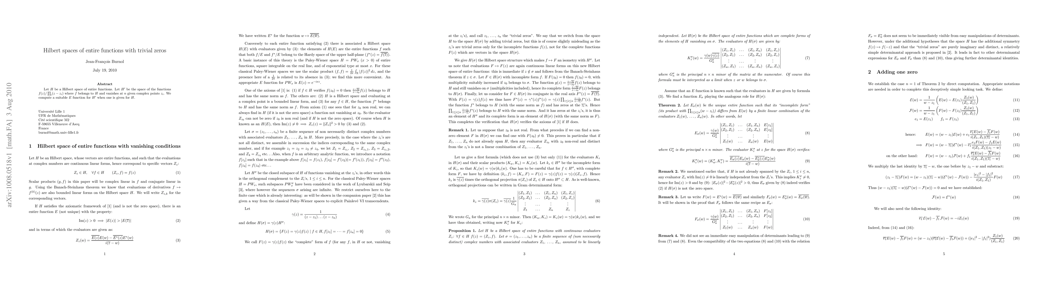 Researchers studied Hilbert spaces of entire functions with zeros at specific points, finding a new function that characterizes the space when one is known for its parent space.