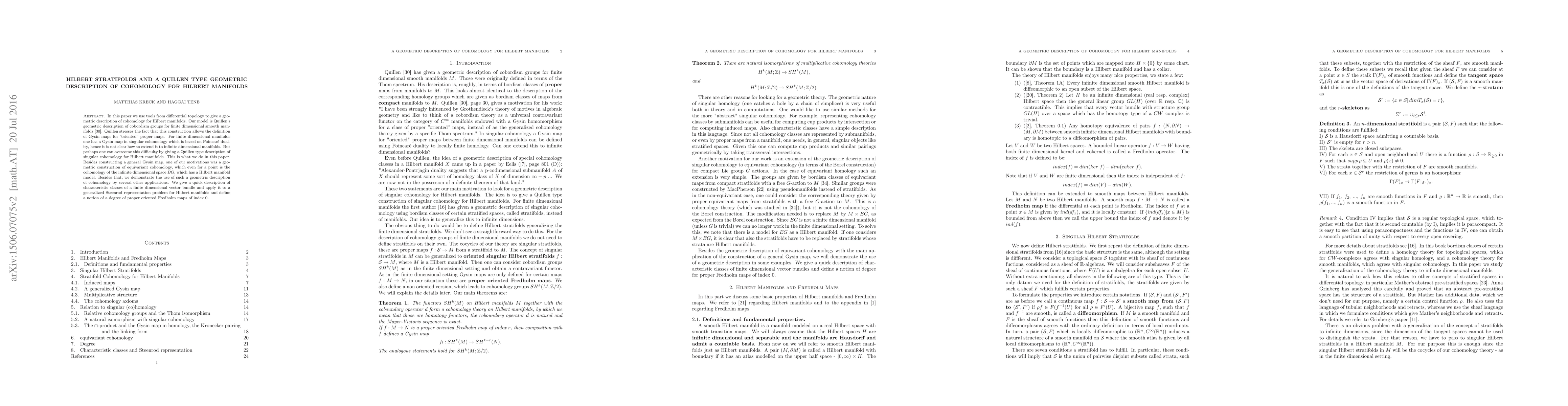 This paper provides a geometric description of cohomology for Hilbert manifolds using Quillen's approach, enabling the definition of Gysin maps and applications in equivariant cohomology, characteristic classes, and a generalized Steenrod representation problem.