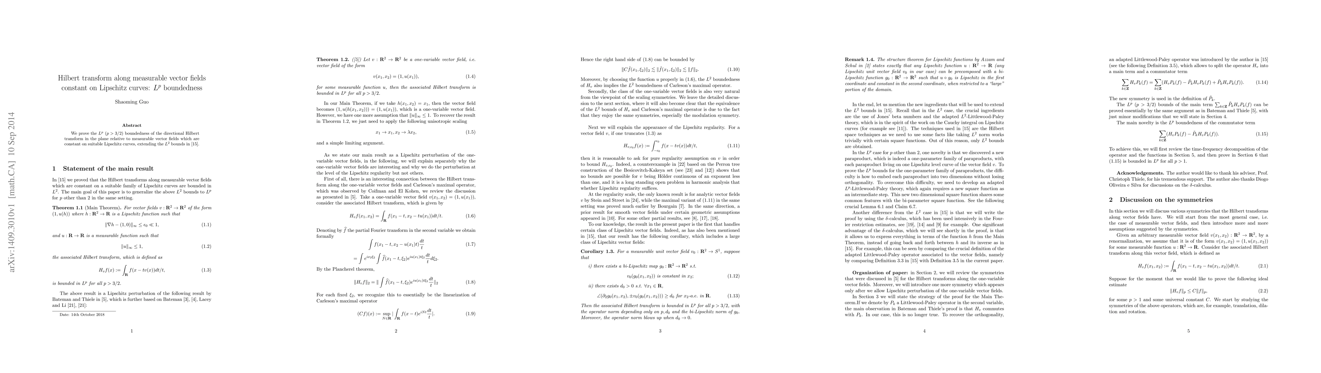 The paper employs techniques from harmonic analysis, specifically focusing on the $L^p$ boundedness of the Hilbert transform along measurable vector fields constant on Lipschitz curves in the plane.