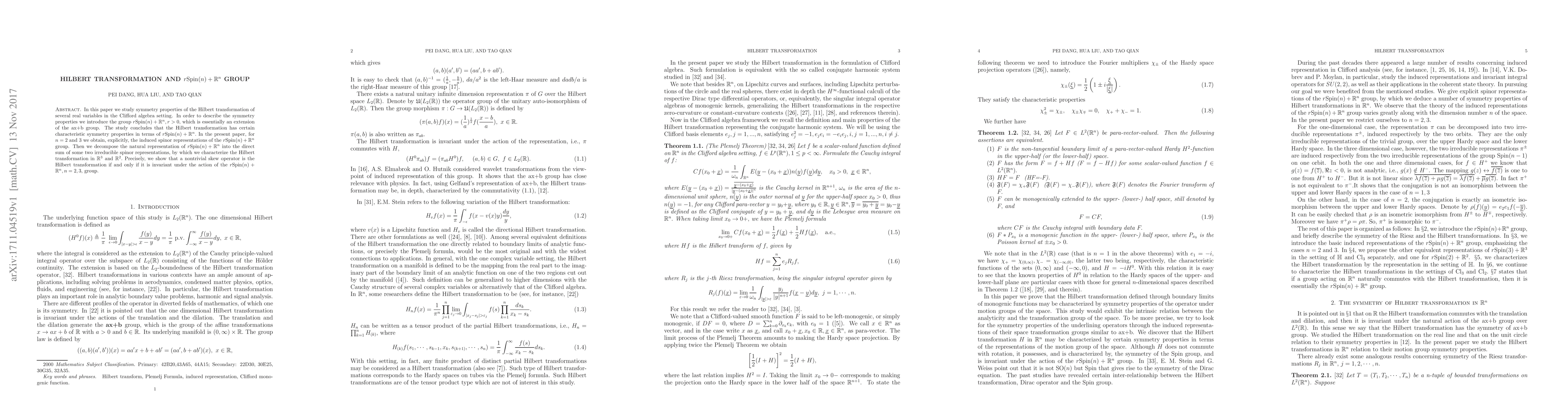 This paper explores the symmetry properties of the Hilbert transformation in the Clifford algebra framework, introducing the $r\mathrm{Spin}(n)+\mathbb{R}^n$ group for $n=2$ and $3$. It characterizes the Hilbert transformation as invariant under the action of this group, decomposing its natural representation into irreducible spinor representations.