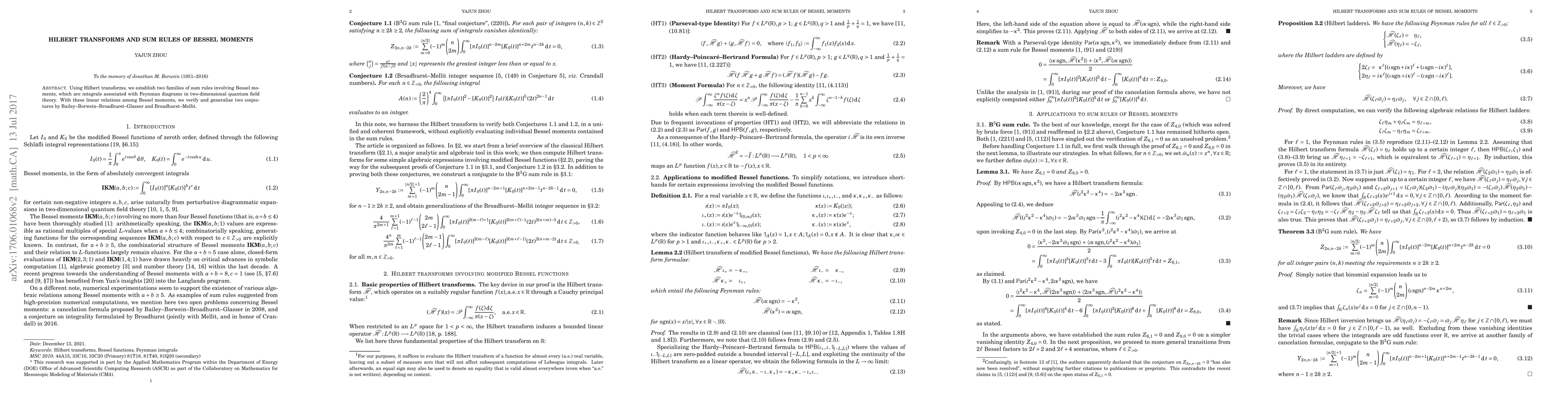 This paper establishes sum rules for Bessel moments using Hilbert transforms and verifies/generalizes conjectures by Bailey-Borwein-Broadhurst-Glasser and Broadhurst-Mellit, which are relevant to Feynman diagrams in quantum field theory.