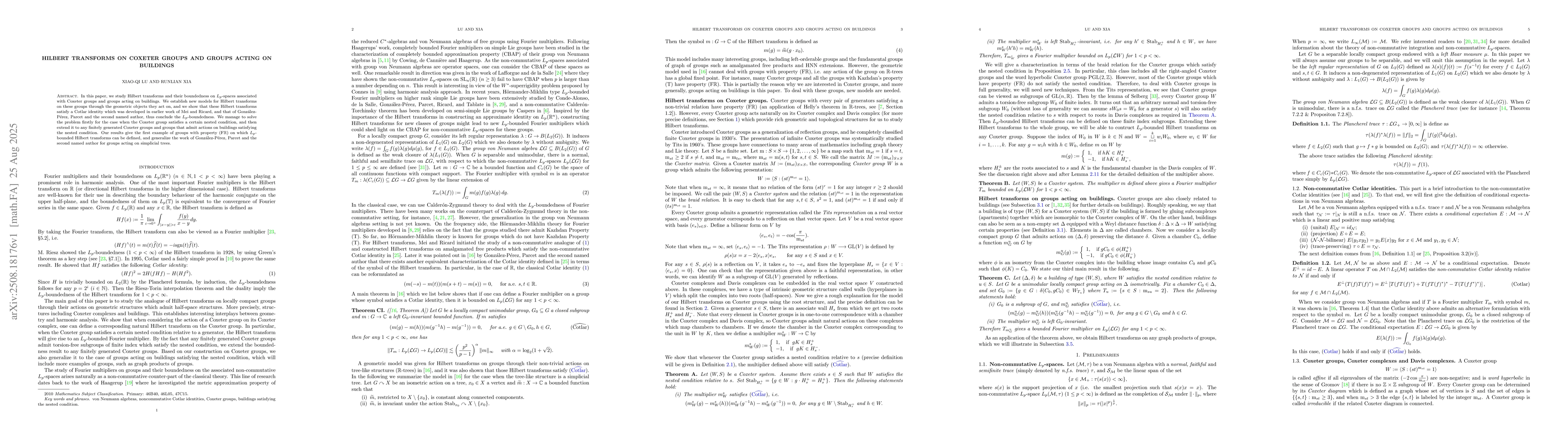 In this paper, we study Hilbert transforms and their boundedness on $L_p$-spaces associated with Coxeter groups and groups acting on buildings. We establish new models for Hilbert transforms on these groups through the geometric objects they act on, and we show that these Hilbert transforms satisfy a Cotlar identity which was developed in earlier work of Mei and Ricard, and that of Gonz\'alez-P\'erez, Parcet and the second named author, thus conclude the $L_p$-boundedness. We manage to solve the problem firstly for the case when the Coxeter group satisfies a certain nested condition, and then extend it to any finitely generated Coxeter groups and groups that admit actions on buildings satisfying the nested condition. Our results give the first example of groups with property (F$\mathbb{R}$) on which $L_p$-bounded Hilbert transforms can be defined, and generalize the work of Gonz\'alez-P\'erez, Parcet and the second named author for groups acting on simplicial trees.