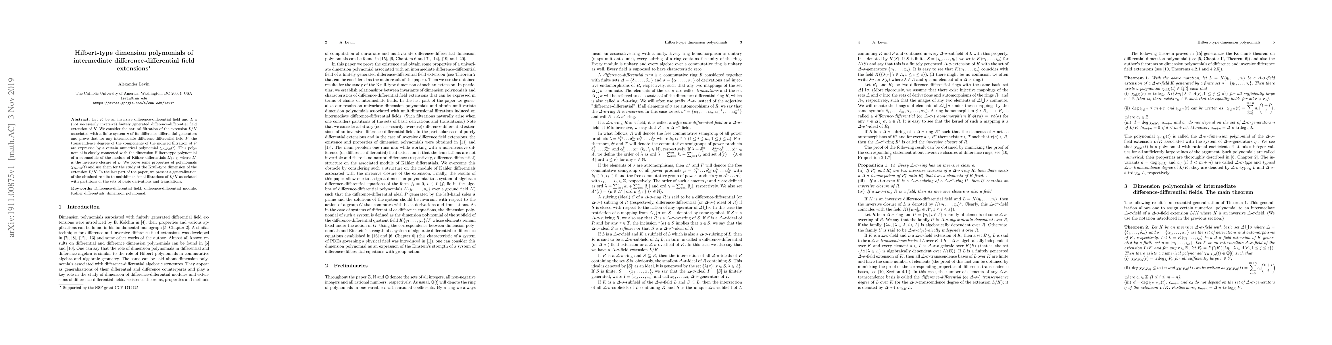 This paper investigates Hilbert-type dimension polynomials for intermediate difference-differential field extensions, proving that the transcendence degrees of intermediate fields are expressed by a polynomial $\chi_{K, F,\eta}(t)$. It also explores the Krull-type dimension of the extension and generalizes the results to multidimensional filtrations.