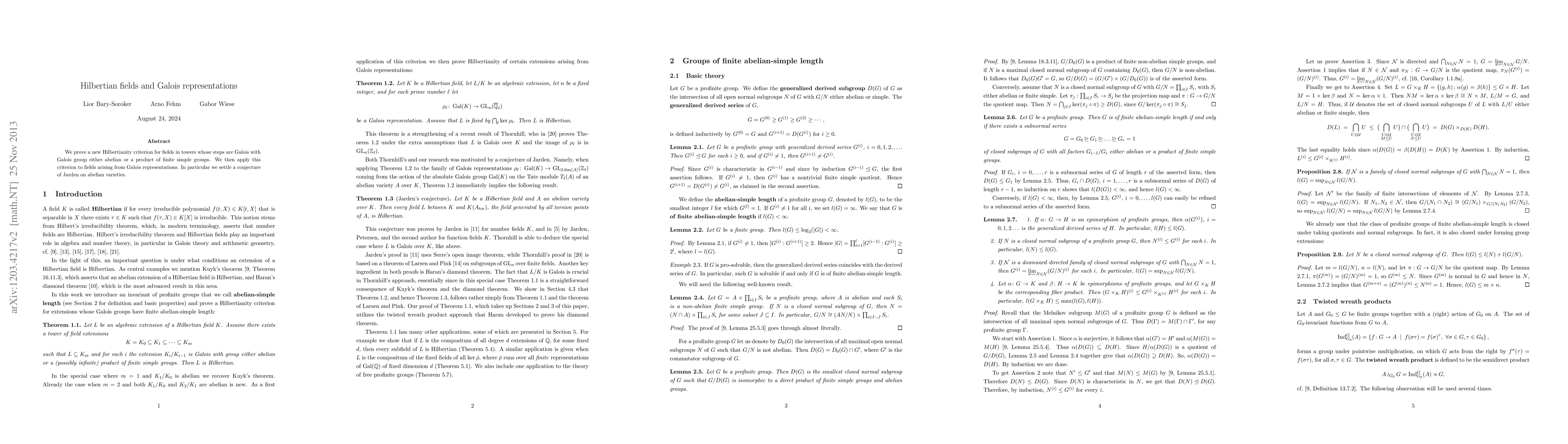 The paper employs a novel Hilbertianity criterion for fields in towers with Galois groups that are either abelian or products of finite simple groups, followed by its application to fields arising from Galois representations.