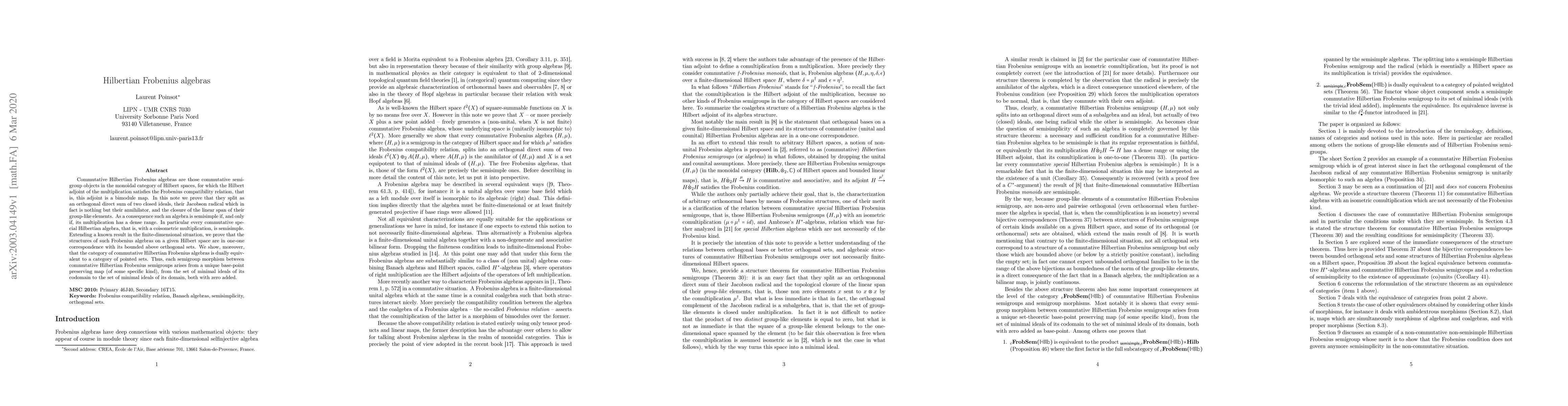 Research proves that commutative Hilbertian Frobenius algebras can be split into two closed ideals: their Jacobson radical and the closure of group-like elements, with implications for semisimplicity and duality equivalences with pointed sets.