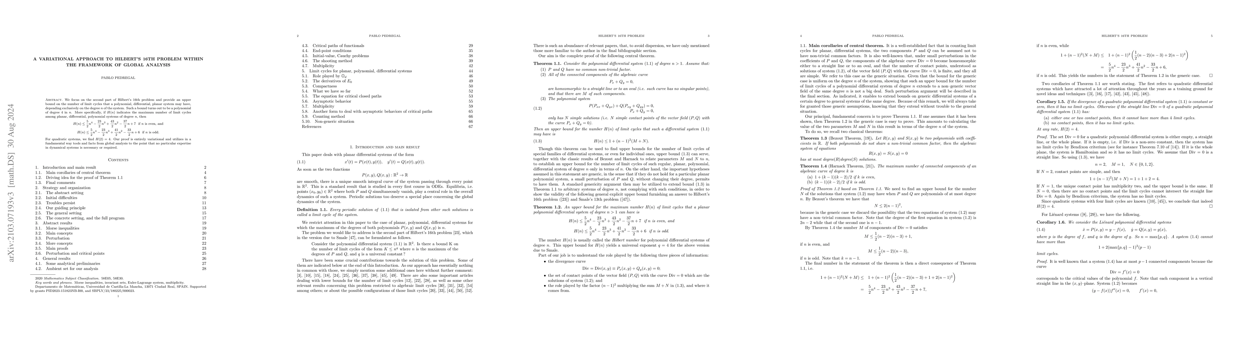 This paper establishes an upper bound for the number of limit cycles in planar polynomial differential systems, showing it is a degree four polynomial in the system's degree. The proof leverages variational techniques and Morse inequalities to count critical points, solving the second part of Hilbert's 16th problem and demonstrating the bound's sharpness for quadratic systems, which can have up to four limit cycles.