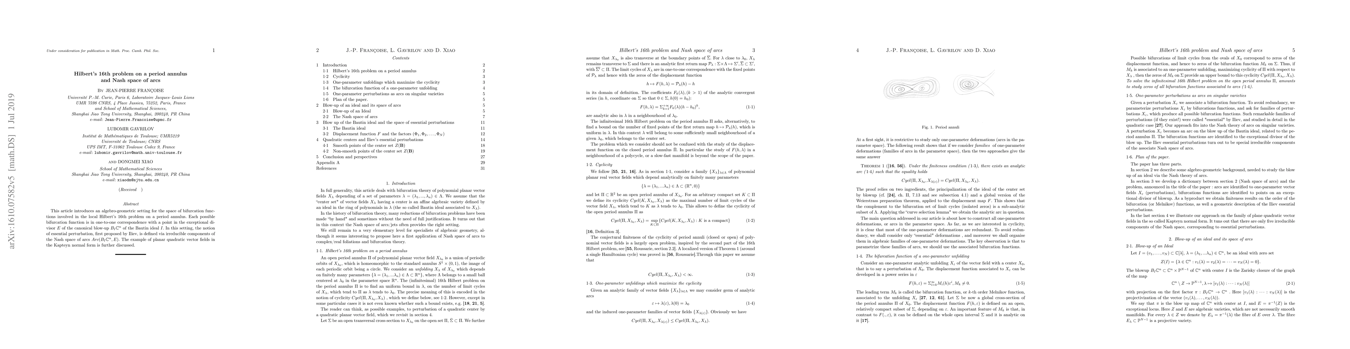 This paper explores an algebro-geometric framework for the space of bifurcation functions in Hilbert's 16th problem on a period annulus, linking them to points in the exceptional divisor of the canonical blow-up of the Bautin ideal. It introduces the concept of essential perturbation via irreducible components of the Nash space of arcs.