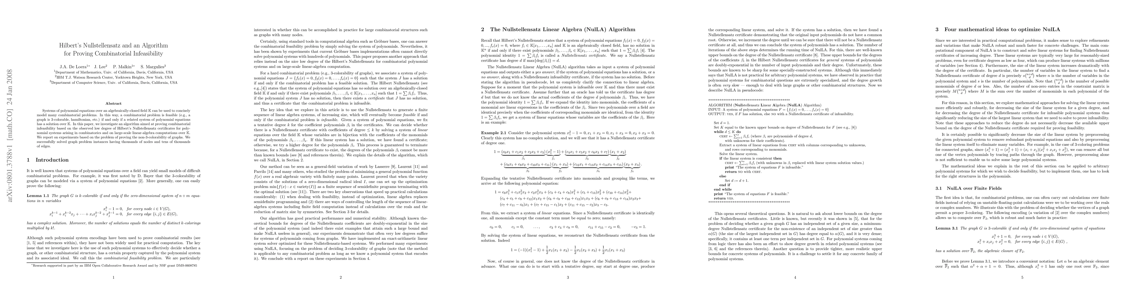 Systems of polynomial equations over an algebraically-closed field K can be used to concisely model many combinatorial problems. In this way, a combinatorial problem is feasible (e.g., a graph is 3-colorable, hamiltonian, etc.) if and only if a related system of polynomial equations has a solution over K. In this paper, we investigate an algorithm aimed at proving combinatorial infeasibility based on the observed low degree of Hilbert's Nullstellensatz certificates for polynomial systems arising in combinatorics and on large-scale linear-algebra computations over K. We report on experiments based on the problem of proving the non-3-colorability of graphs. We successfully solved graph problem instances having thousands of nodes and tens of thousands of edges.