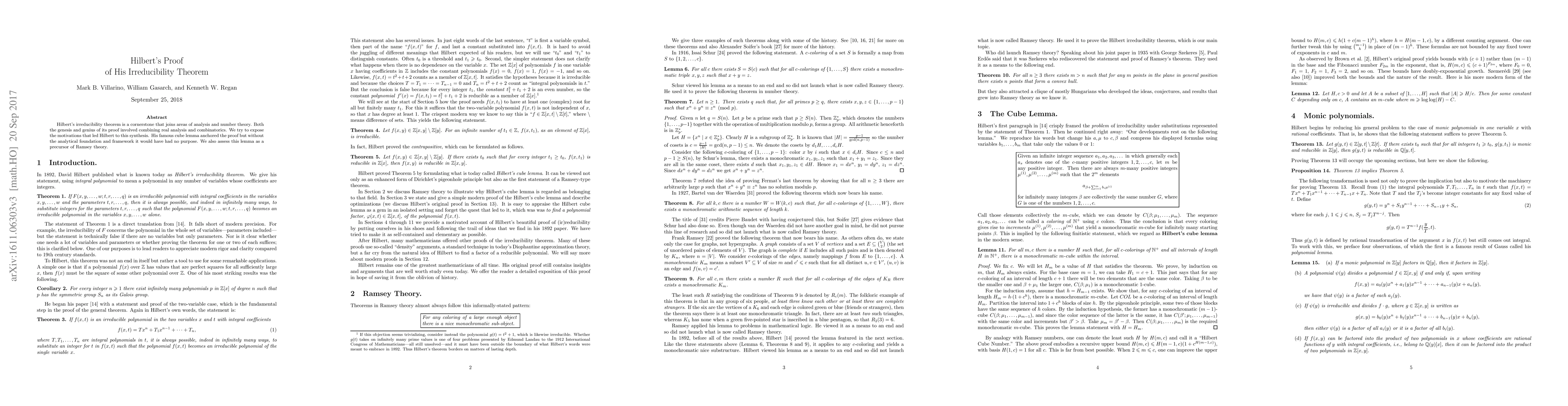 Hilbert's Irreducibility Theorem merges analysis and number theory, demonstrating the power of combining real analysis and combinatorics. The proof leverages Hilbert's Cube Lemma, which, while foreshadowing Ramsey Theory, differs in motivation and relies on an analytical framework.
