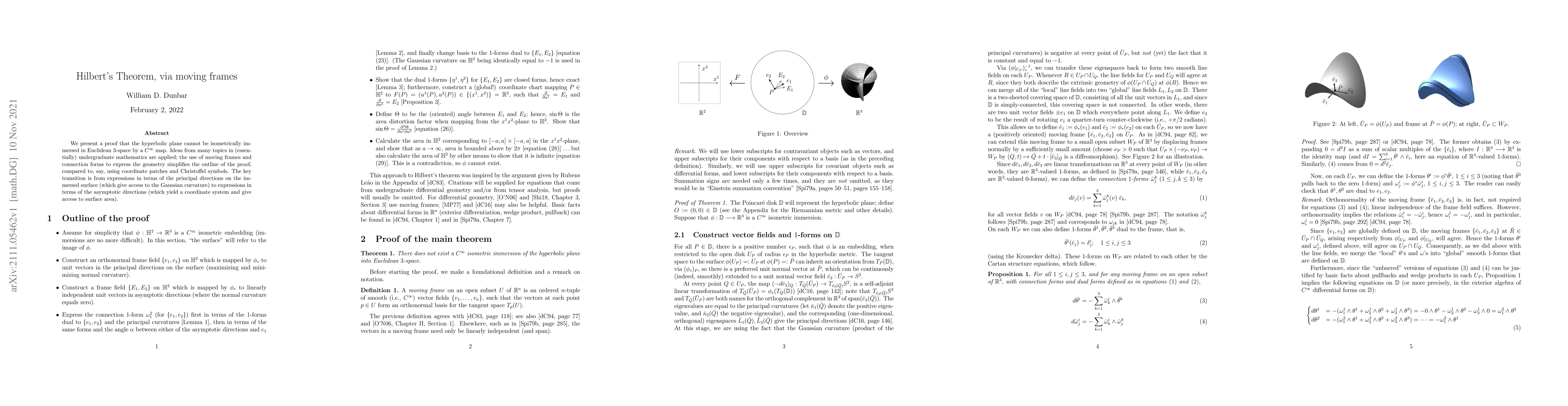 We present a proof that the hyperbolic plane cannot be isometrically immersed in Euclidean $3$-space by a $C^\infty$ map. Ideas from many topics in (essentially) undergraduate mathematics are applied; the use of moving frames and connection forms to express the geometry simplifies the outline of the proof, compared to, say, using coordinate patches and Christoffel symbols. The key transition is from expressions in terms of the principal directions on the immersed surface (which give access to the Gaussian curvature) to expressions in terms of the asymptotic directions (which yield a coordinate system and give access to surface area).
