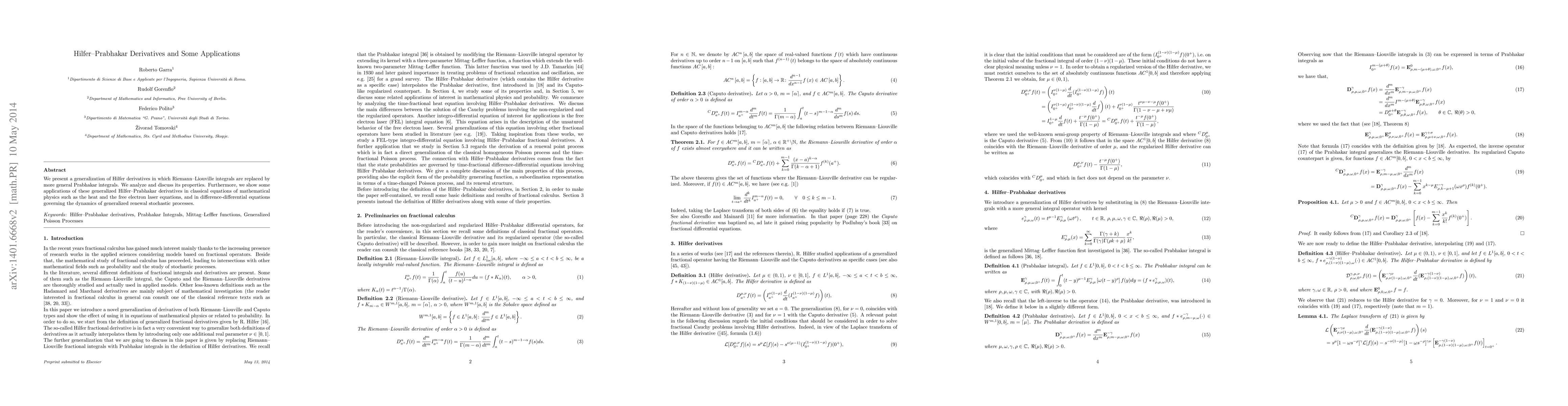 This paper generalizes Hilfer derivatives using Prabhakar integrals, analyzing their properties and demonstrating applications in mathematical physics equations and stochastic processes. The new derivatives extend classical models to more complex scenarios.