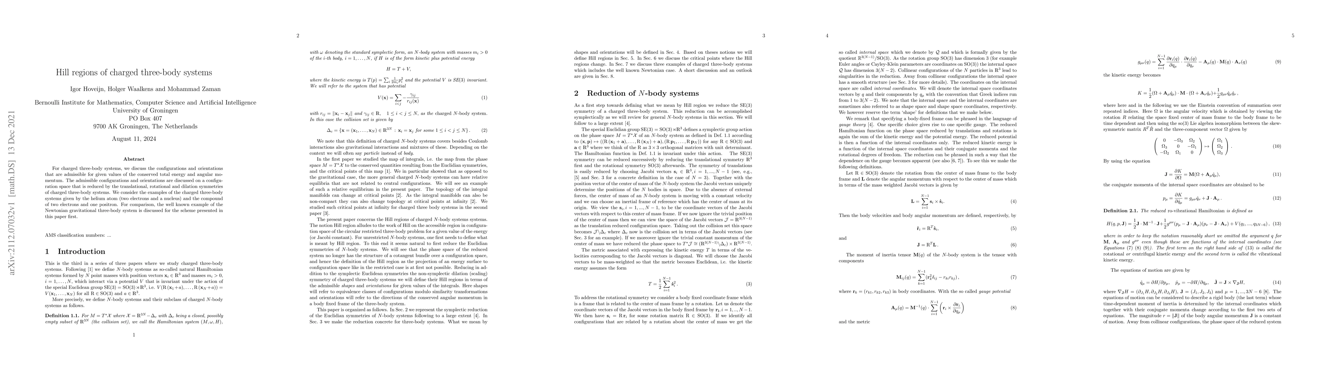 For charged three-body systems, we discuss the configurations and orientations that are admissible for given values of the conserved total energy and angular momentum. The admissible configurations and orientations are discussed on a configuration space that is reduced by the translational, rotational and dilation symmetries of charged three-body systems. We consider the examples of the charged three-body systems given by the helium atom (two electrons and a nucleus) and the compound of two electrons and one positron. For comparison, the well known example of the Newtonian gravitational three-body system is discussed for the scheme presented in this paper first.