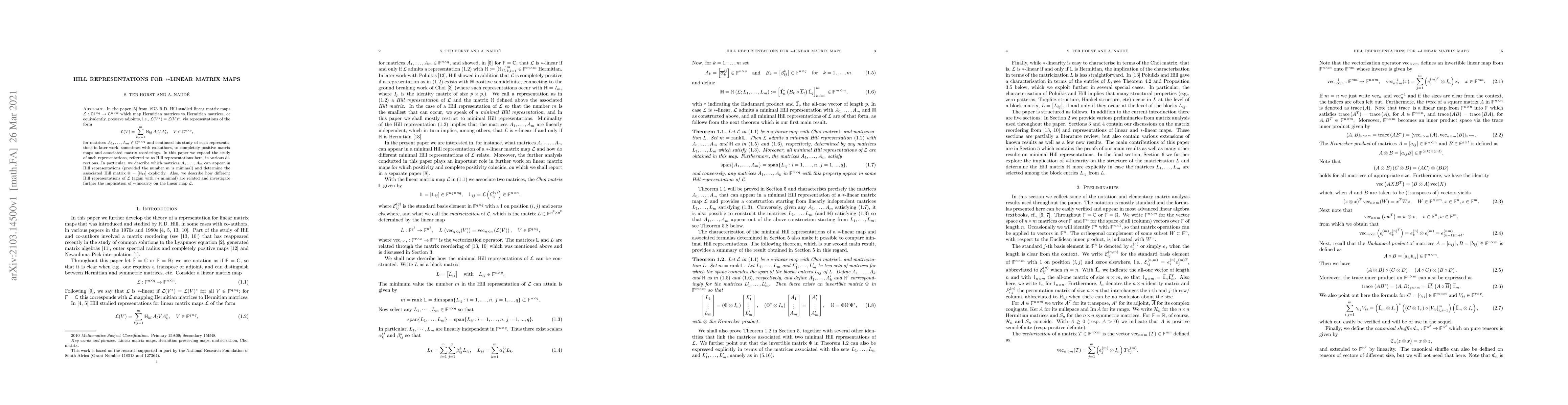 In a paper from 1973 R.D. Hill studied linear matrix maps $\mathcal{L}:\mathbb{C}^{q \times q}\to\mathbb{C}^{n \times n}$ which map Hermitian matrices to Hermitian matrices, or equivalently, preserve adjoints, i.e., $\mathcal{L}(V^*)=\mathcal{L}(V)^*$, via representations of the form \begin{equation*} \mathcal{L}(V)=\sum_{k,l=1}^m \mathbb{H}_{kl}\, A_l V A_k^*,\quad V\in\mathbb{C}^{q \times q}, \end{equation*} for matrices $A_1,\ldots,A_m \in\mathbb{C}^{n \times q}$ and continued his study of such representations in later work, sometimes with co-authors, to completely positive matrix maps and associated matrix reorderings. In this paper we expand the study of such representations, referred to as Hill representations here, in various directions. In particular, we describe which matrices $A_1,\ldots, A_m$ can appear in Hill representations (provided the number $m$ is minimal) and determine the associated Hill matrix $\mathbb{H}=\left[\mathbb{H}_{kl}\right]$ explicitly. Also, we describe how different Hill representations of $\mathcal{L}$ (again with $m$ minimal) are related and investigate further the implication of $*$-linearity on the linear map $\mathcal{L}$.