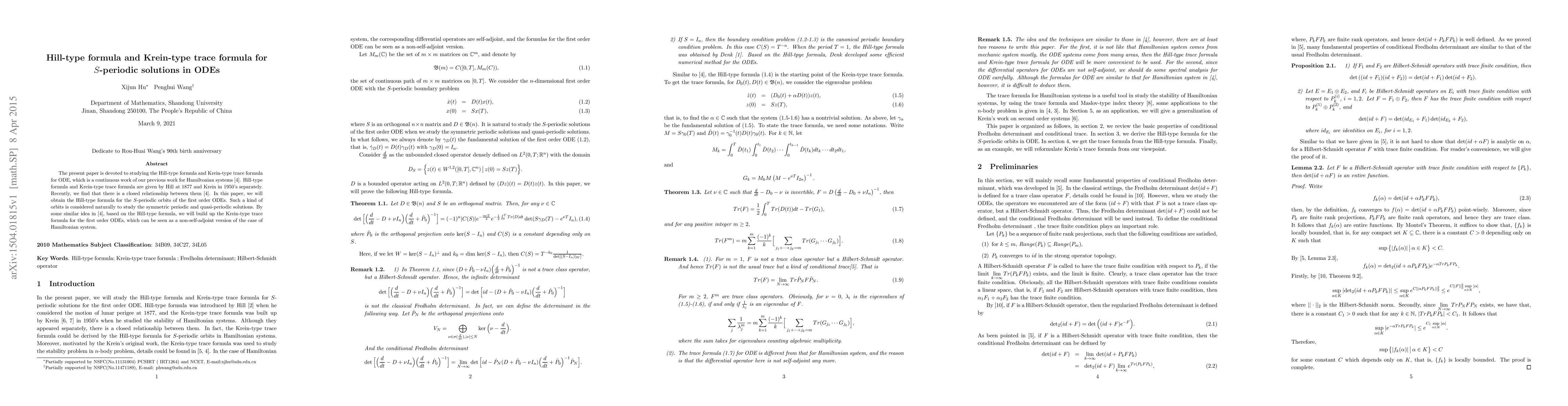 The present paper is devoted to studying the Hill-type formula and Krein-type trace formula for ODE, which is a continuous work of our previous work for Hamiltonian systems \cite{HOW}. Hill-type formula and Krein-type trace formula are given by Hill at 1877 and Krein in 1950's separately. Recently, we find that there is a closed relationship between them \cite{HOW}. In this paper, we will obtain the Hill-type formula for the $S$-periodic orbits of the first order ODEs. Such a kind of orbits is considered naturally to study the symmetric periodic and quasi-periodic solutions. By some similar idea in \cite{HOW}, based on the Hill-type formula, we will build up the Krein-type trace formula for the first order ODEs, which can be seen as a non-self-adjoint version of the case of Hamiltonian system.