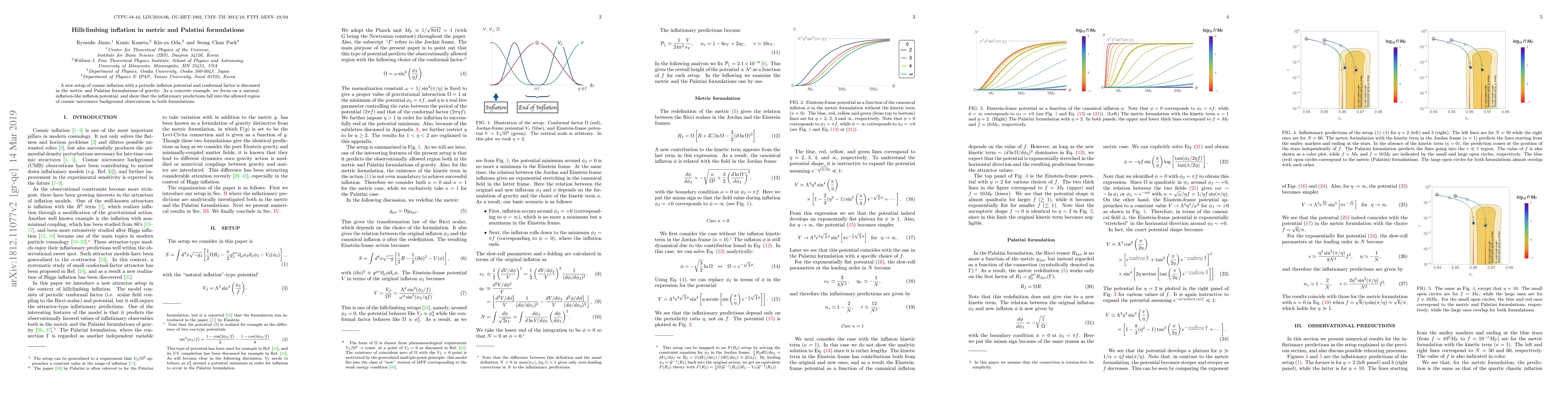 This paper explores hillclimbing inflation using a periodic inflaton potential within both metric and Palatini formulations of gravity, demonstrating that the model's predictions align with observed cosmic microwave background data. A natural-inflation-like potential is used to illustrate the compatibility of these formulations.