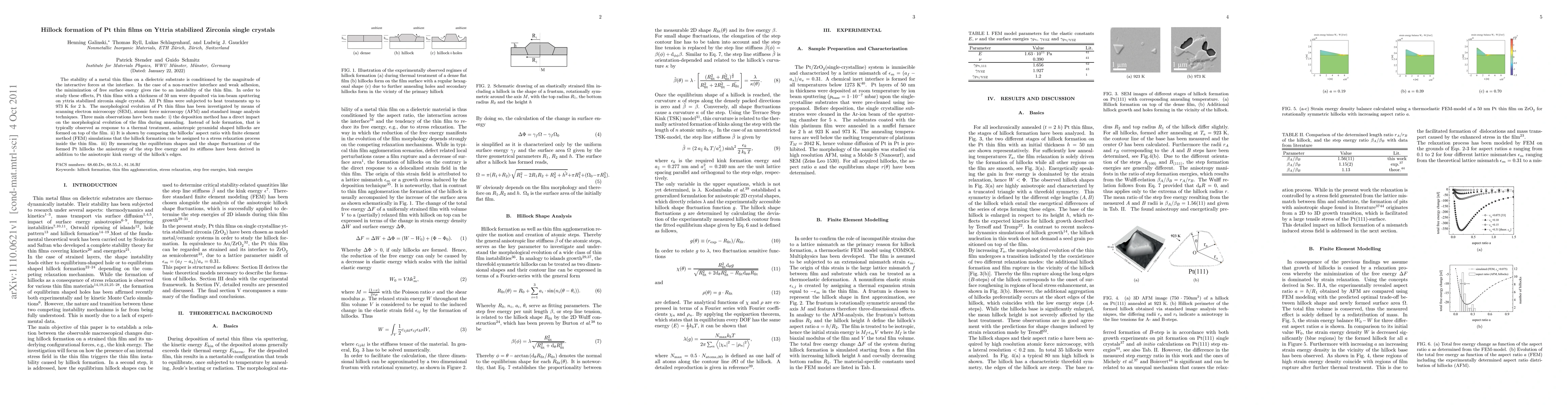 The stability of a metal thin films on a dielectric substrate is conditioned by the magnitude of the interactive forces at the interface. In the case of a non-reactive interface and weak adhesion, the minimization of free surface energy gives rise to an instability of the thin film. In order to study these effects, Pt thin films with a thickness of 50 nm were deposited via ion-beam sputtering on yttria stabilized zirconia single crystals. All Pt films were subjected to heat treatments up to 973 K for 2 h. The morphological evolution of Pt thin films has been investigated by means of scanning electron microscopy (SEM), atomic force microscopy (AFM) and standard image analysis techniques. Three main observations have been made: i) the deposition method has a direct impact on the morphological evolution of the film during annealing. Instead of hole formation, that is typically observed as response to a thermal treatment, anisotropic pyramidal shaped hillocks are formed on top of the film. ii) It is shown by comparing the hillocks' aspect ratio with finite element method (FEM) simulations that the hillock formation can be assigned to a stress relaxation process inside the thin film. iii) By measuring the equilibrium shapes and the shape fluctuations of the formed Pt hillocks the anisotropy of the step free energy and its stiffness have been derived in addition to the anisotropic kink energy of the hillock's edges.
