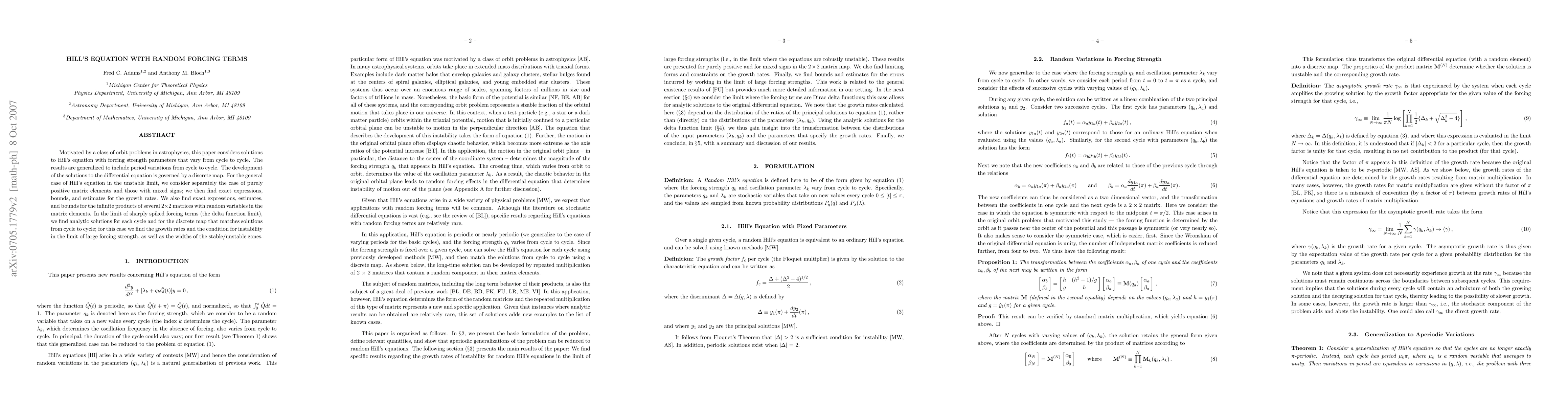 This paper solves Hill's equation with randomly varying forcing strength parameters, finding exact expressions for growth rates and instability conditions in different cases, with implications for astrophysics orbit problems.
