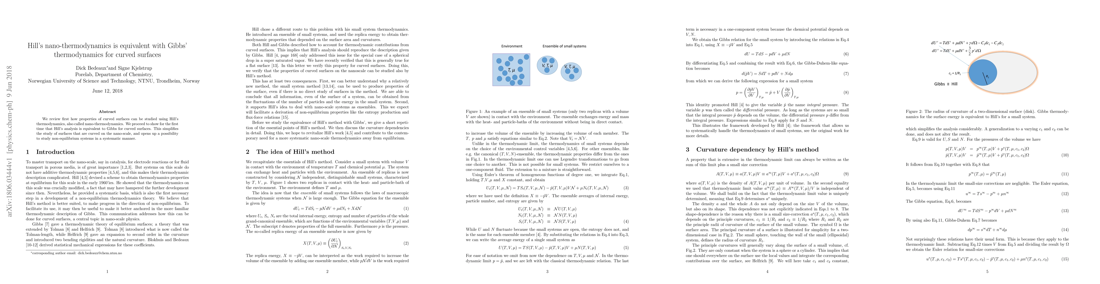 We review first how properties of curved surfaces can be studied using Hill's thermodynamics, also called nano-thermodynamics. We proceed to show for the first time that Hill's analysis is equivalent to Gibbs for curved surfaces. This simplifies the study of surfaces that are curved on the nano-scale, and opens up a possibility to study non-equilibrium systems in a systematic manner.