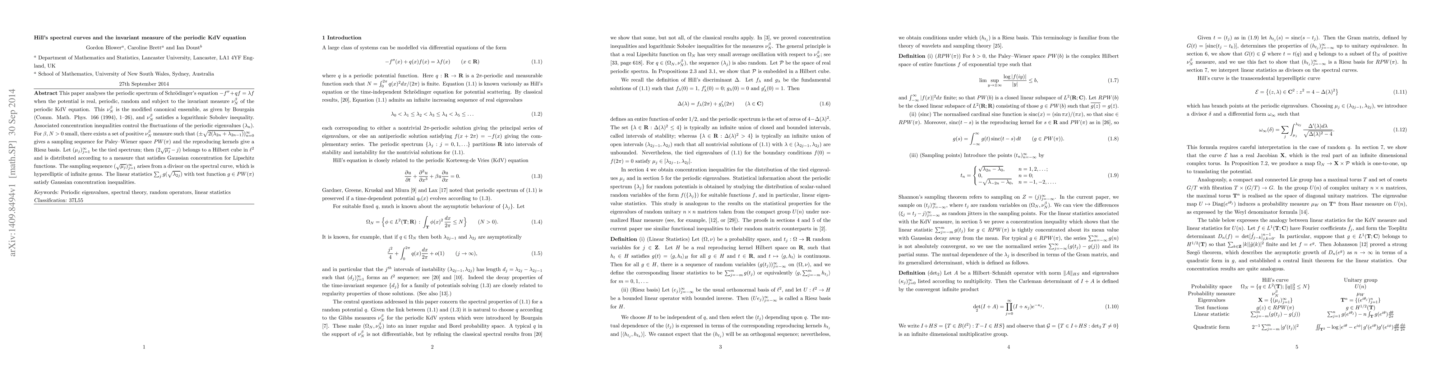 This paper analyses the periodic spectrum of Schr\"odinger's equation $-f''+qf=\lambda f$ when the potential is real, periodic, random and subject to the invariant measure $\nu_N^\beta$ of the periodic KdV equation. This $\nu_N^\beta$ is the modified canonical ensemble, as given by Bourgain ({Comm. Math. Phys.} {166} (1994), 1--26), and $\nu_N^\beta$ satisfies a logarithmic Sobolev inequality. Associated concentration inequalities control the fluctuations of the periodic eigenvalues $(\lambda_n)$. For $\beta, N>0$ small, there exists a set of positive $\nu_N^\beta$ measure such that $(\pm \sqrt{2(\lambda_{2n}+\lambda_{2n-1})})_{n=0}^\infty$ gives a sampling sequence for Paley--Wiener space $PW(\pi )$ and the reproducing kernels give a Riesz basis. Let $(\mu_j)_{j=1}^\infty$ be the tied spectrum; then $(2\sqrt{\mu_j}-j)$ belongs to a Hilbert cube in $\ell^2$ and is distributed according to a measure that satisfies Gaussian concentration for Lipschitz functions. The sampling sequence $(\sqrt{\mu_j})_{j=1}^\infty$ arises from a divisor on the spectral curve, which is hyperelliptic of infinite genus. The linear statistics $\sum_j g(\sqrt{\lambda_{2j}})$ with test function $g\in PW(\pi)$ satisfy Gaussian concentration inequalities.