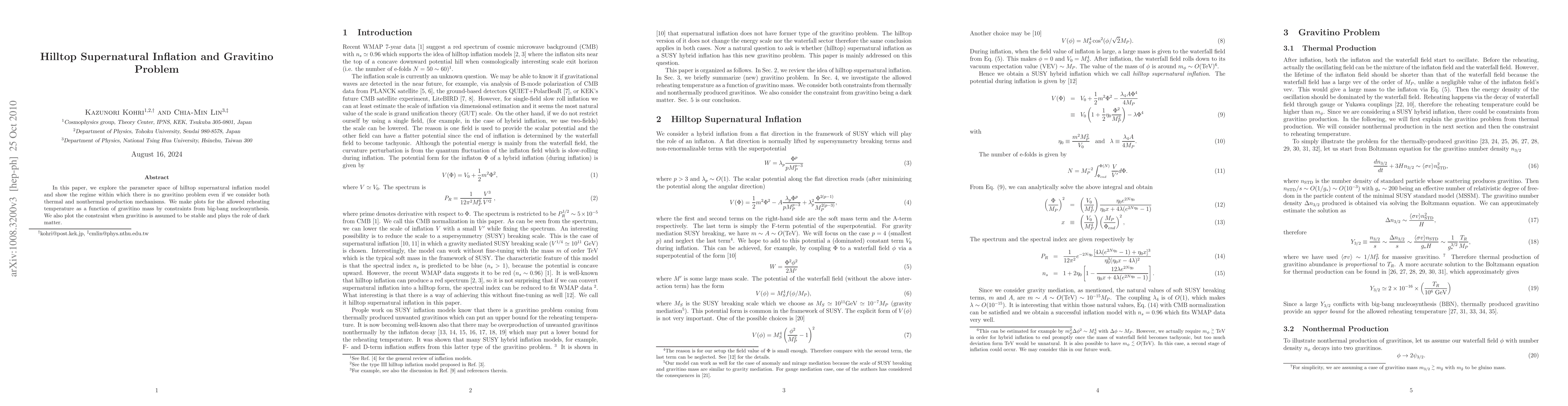 This paper investigates the parameter space of the hilltop supernatural inflation model to identify regimes where the gravitino problem is avoided, considering both thermal and nonthermal production mechanisms. It provides plots for allowed reheating temperatures based on big-bang nucleosynthesis constraints and examines scenarios where gravitino stability could imply its role as dark matter.