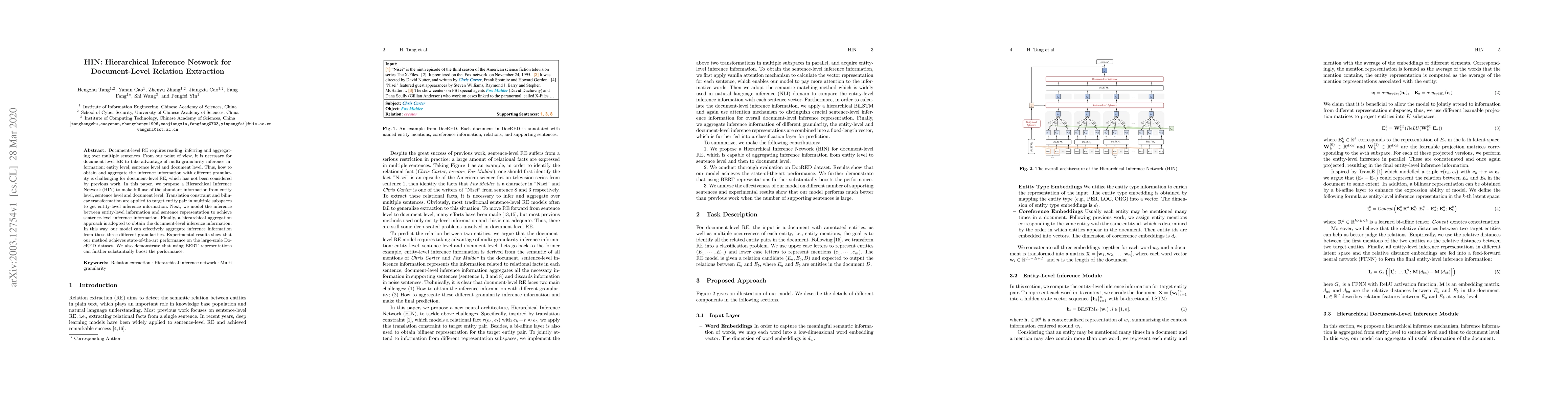The paper proposes a Hierarchical Inference Network (HIN) to extract document-level relations by leveraging multi-granularity inference from entity, sentence, and document levels. The model uses translation constraints and bilinear transformations for entity-level inference, sentence-level inference through entity-sentence modeling, and hierarchical aggregation for document-level inference, achieving state-of-the-art performance on the DocRED dataset.