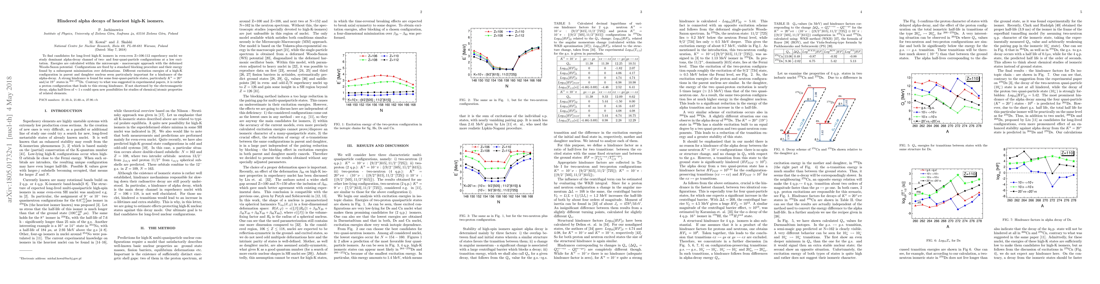 To find candidates for long-lived high-K isomers in even-even Z=106-112 superheavy nuclei we study dominant alpha-decay channel of two- and four-quasi-particle configurations at a low excitation. Energies are calculated within the microscopic - macroscopic approach with the deformed Woods-Saxon potential. Configurations are fixed by a standard blocking procedure and their energy found by a subsequent minimization over deformations. Different excitation energies of a high-K configuration in parent and daughter nucleus seem particularly important for a hindrance of the alpha-decay. A strong hindrance is found for some four-quasi-particle states, particularly $K^{\pi} = 20^{+}$ and/or $19^{+}$ states in $^{264-270}$Ds. Contrary to what was suggested in experimental papers, it is rather a proton configuration that leads to this strong hindrance. If not shortened by the electromagnetic decay, alpha half-lives of $\sim$ 1 s could open new possibilities for studies of chemical/atomic properties of related elements.