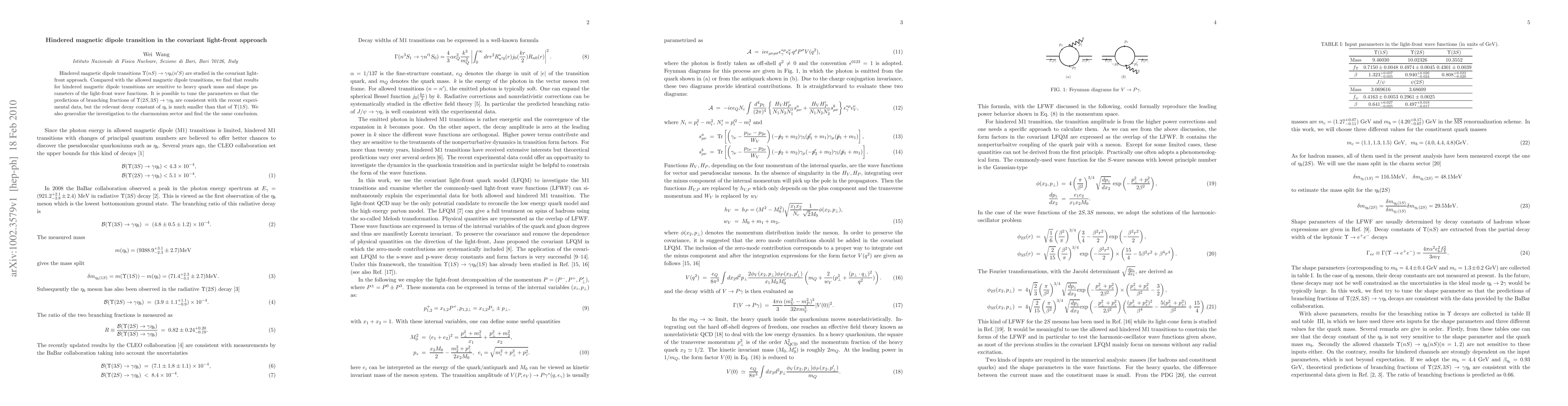Hindered magnetic dipole transitions $\Upsilon(nS)\to \gamma \eta_b(n'S)$ are studied in the covariant light-front approach. Compared with the allowed magnetic dipole transitions, we find that results for hindered magnetic dipole transitions are sensitive to heavy quark mass and shape parameters of the light-front wave functions. It is possible to tune the parameters so that the predictions of branching fractions of $\Upsilon(2S,3S)\to\gamma\eta_b$ are consistent with the recent experimental data, but the relevant decay constant of $\eta_b$ is much smaller than that of $\Upsilon(1S)$. We also generalize the investigation to the charmonium sector and find the the same conclusion.
