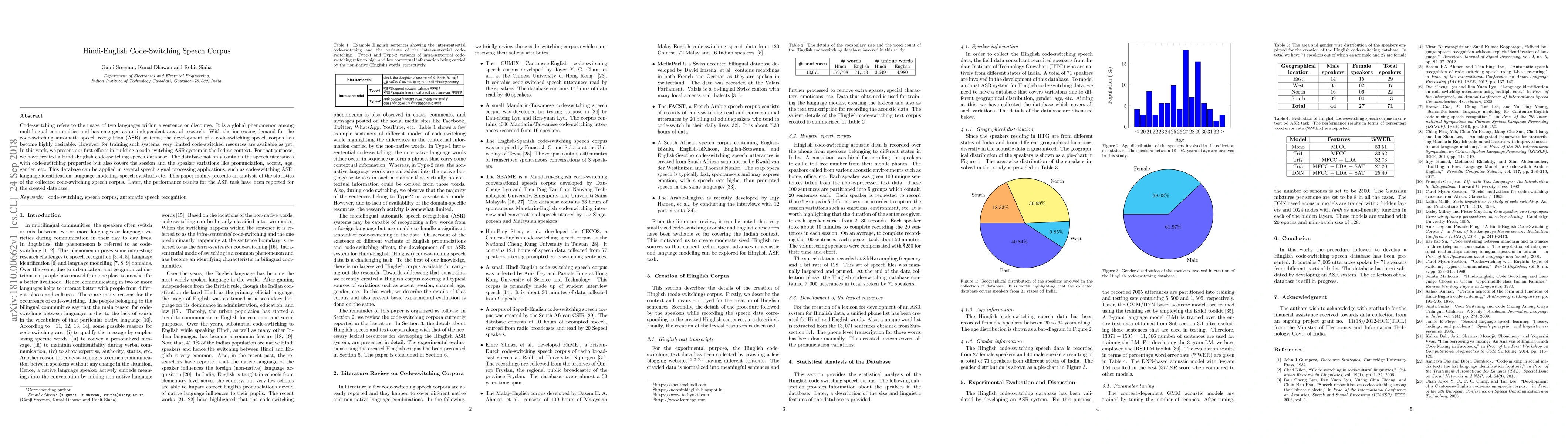 This paper presents a Hindi-English code-switching speech corpus developed to support automatic speech recognition systems, analyzing its statistical properties and reporting initial ASR performance results. The corpus includes diverse speaker variations and can be utilized for various speech signal processing applications.