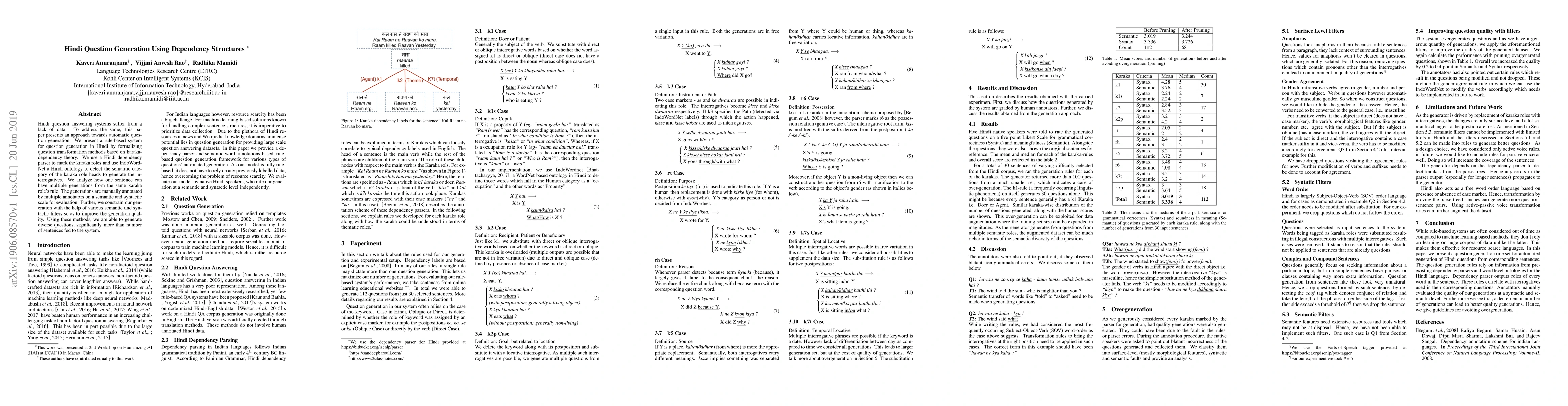 This paper proposes a rule-based system for automatic question generation in Hindi using dependency structures and karaka-dependency theory. It leverages a Hindi dependency parser and IndoWordNet to generate diverse questions, which are evaluated through manual annotation and constrained by semantic and syntactic filters.