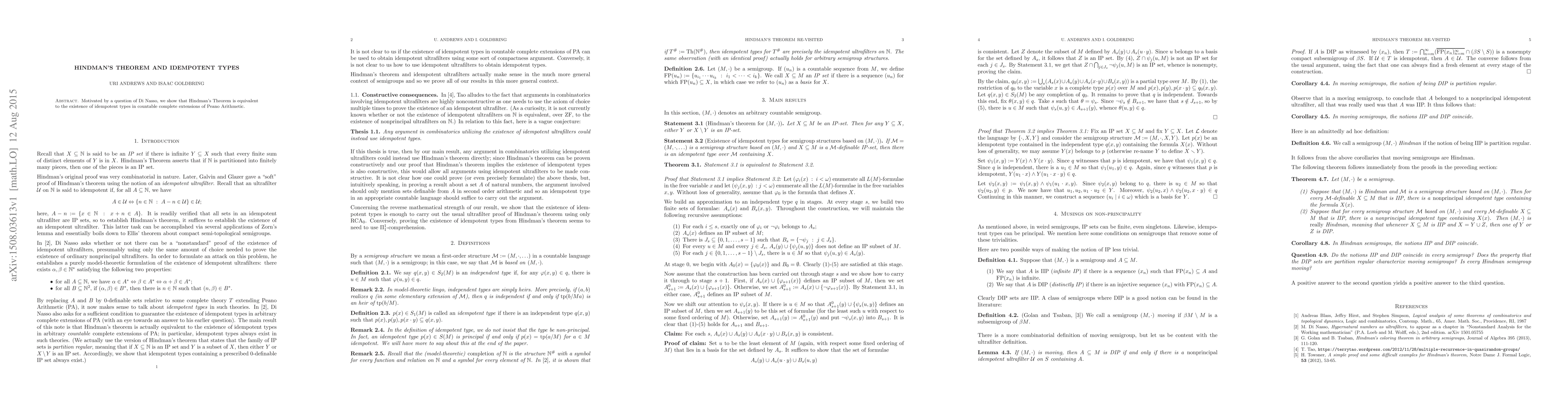 Summary: Hindman's theorem is proven to be equivalent to the existence of idempotent types in countable complete extensions of Peano Arithmetic, addressing a question posed by Di Nasso. This establishes a significant connection between combinatorial number theory and mathematical logic.