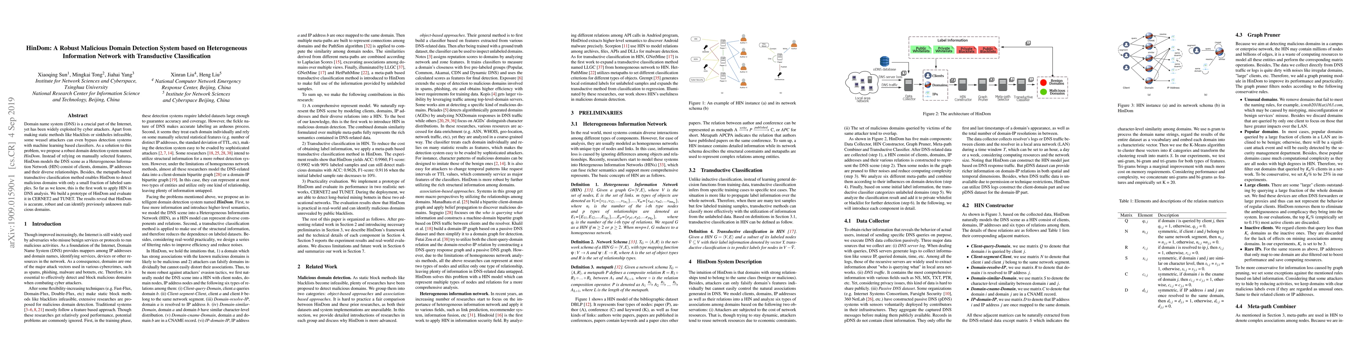 Domain name system (DNS) is a crucial part of the Internet, yet has been widely exploited by cyber attackers. Apart from making static methods like blacklists or sinkholes infeasible, some weasel attackers can even bypass detection systems with machine learning based classifiers. As a solution to this problem, we propose a robust domain detection system named HinDom. Instead of relying on manually selected features, HinDom models the DNS scene as a Heterogeneous Information Network (HIN) consist of clients, domains, IP addresses and their diverse relationships. Besides, the metapath-based transductive classification method enables HinDom to detect malicious domains with only a small fraction of labeled samples. So far as we know, this is the first work to apply HIN in DNS analysis. We build a prototype of HinDom and evaluate it in CERNET2 and TUNET. The results reveal that HinDom is accurate, robust and can identify previously unknown malicious domains.