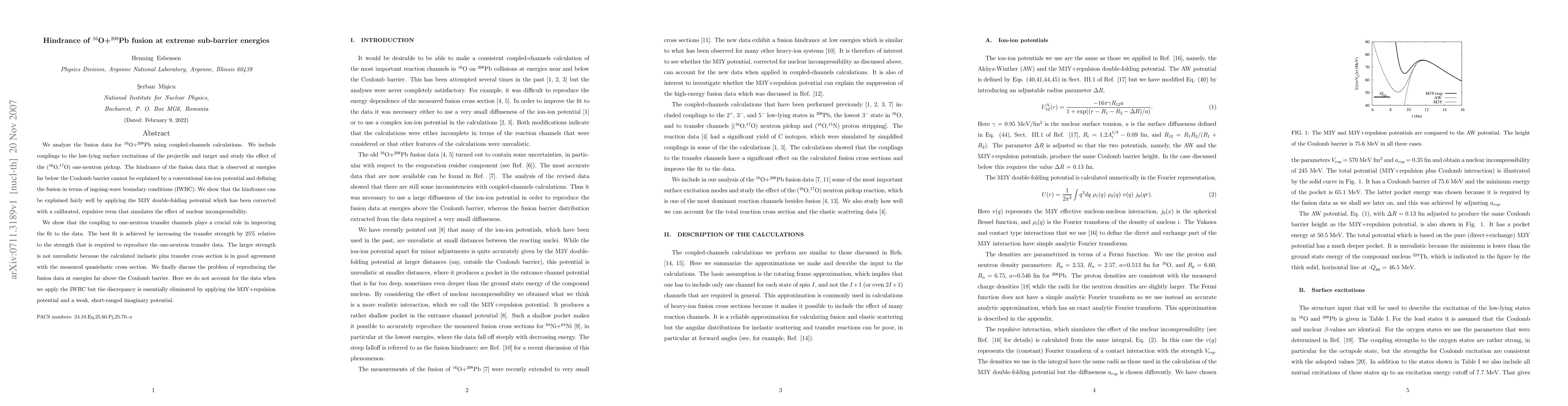 We analyze the fusion data for $^{16}$O+$^{208}$Pb using coupled-channels calculations. We include couplings to the low-lying surface excitations of the projectile and target and study the effect of the ($^{16}$O,$^{17}$O) one-neutron pickup. The hindrance of the fusion data that is observed at energies far below the Coulomb barrier cannot be explained by a conventional ion-ion potential and defining the fusion in terms of ingoing-wave boundary conditions (IWBC). We show that the hindrance can be explained fairly well by applying the M3Y double-folding potential which has been corrected with a calibrated, repulsive term that simulates the effect of nuclear incompressibility. We show that the coupling to one-neutron transfer channels plays a crucial role in improving the fit to the data. The best fit is achieved by increasing the transfer strength by 25% relative to the strength that is required to reproduce the one-neutron transfer data. The larger strength is not unrealistic because the calculated inelastic plus transfer cross section is in good agreement with the measured quasielastic cross section. We finally discuss the problem of reproducing the fusion data at energies far above the Coulomb barrier. Here we do not account for the data when we apply the IWBC but the discrepancy is essentially eliminated by applying the M3Y+repulsion potential and a weak, short-ranged imaginary potential.