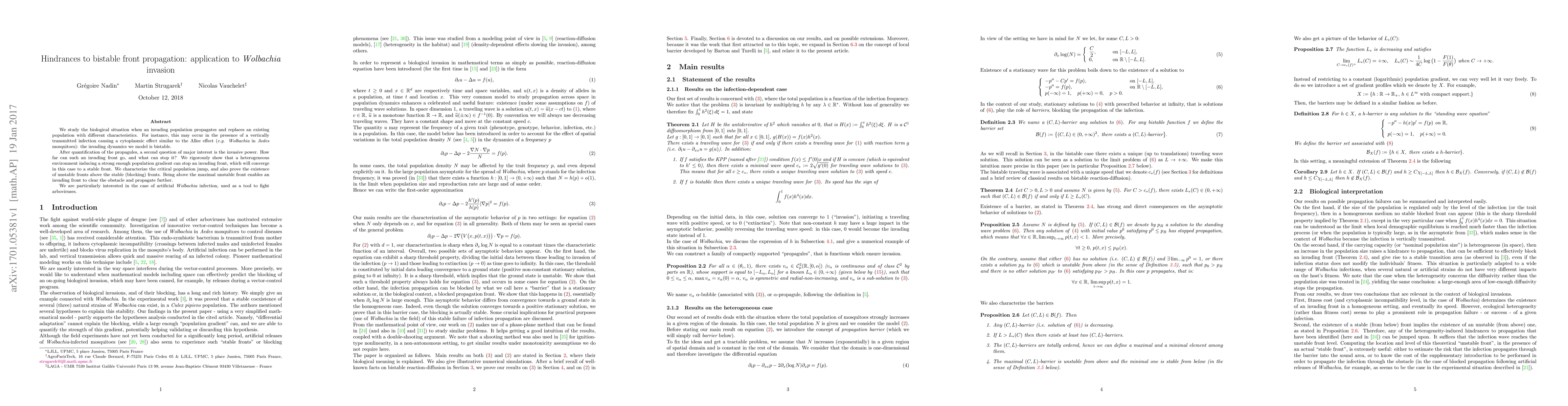 We study the biological situation when an invading population propagates and replaces an existing population with different characteristics. For instance, this may occur in the presence of a vertically transmitted infection causing a cytoplasmic effect similar to the Allee effect (e.g. Wolbachia in Aedes mosquitoes): the invading dynamics we model is bistable. After quantification of the propagules, a second question of major interest is the invasive power. How far can such an invading front go, and what can stop it? We rigorously show that a heterogeneous environment inducing a strong enough population gradient can stop an invading front, which will converge in this case to a stable front. We characterize the critical population jump, and also prove the existence of unstable fronts above the stable (blocking) fronts. Being above the maximal unstable front enables an invading front to clear the obstacle and propagate further. We are particularly interested in the case of artificial Wolbachia infection, used as a tool to fight arboviruses.