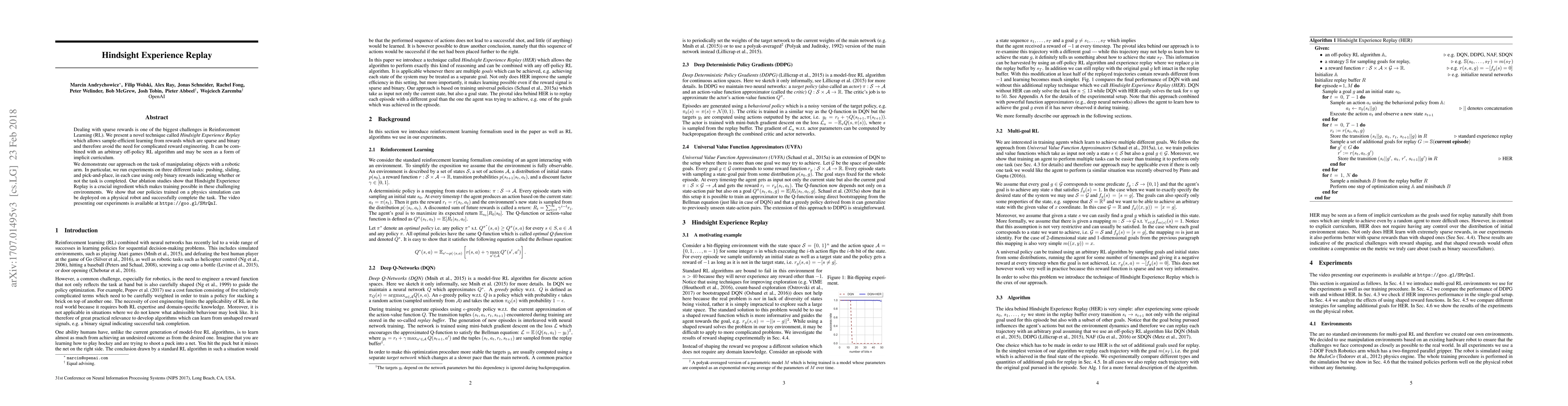 The paper introduces Hindsight Experience Replay, a method for sample-efficient learning in reinforcement learning settings with sparse, binary rewards, avoiding complex reward engineering. Demonstrated on robotic arm tasks, it effectively trains policies that can successfully complete pushing, sliding, and pick-and-place tasks, even when transferred to a physical robot.