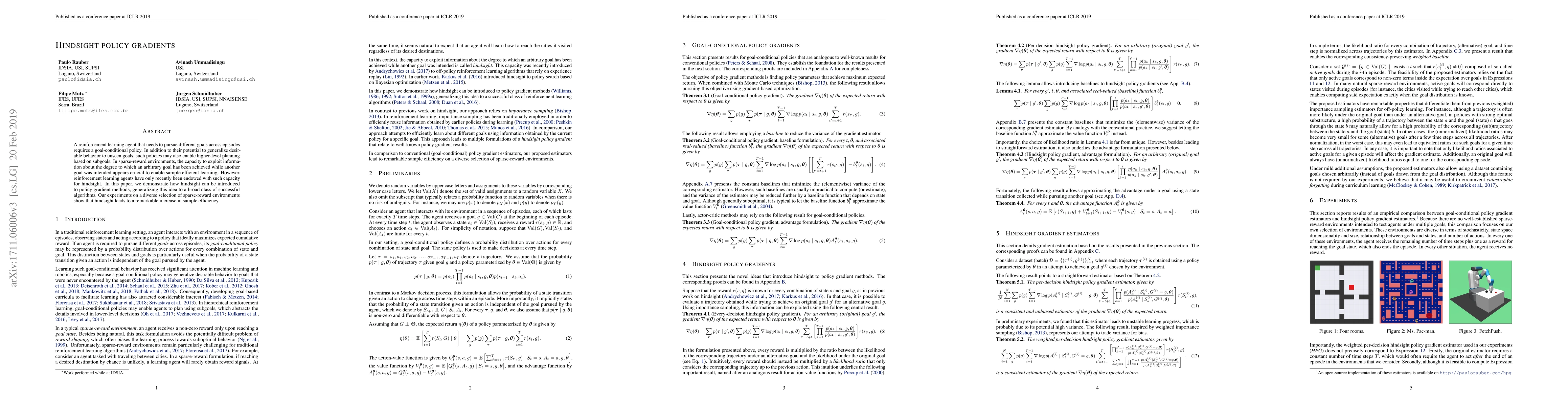 This paper introduces hindsight policy gradients to enhance reinforcement learning agents' ability to learn from past experiences and achieve goals efficiently. The approach significantly improves sample efficiency in sparse-reward environments by leveraging information about goal achievement.