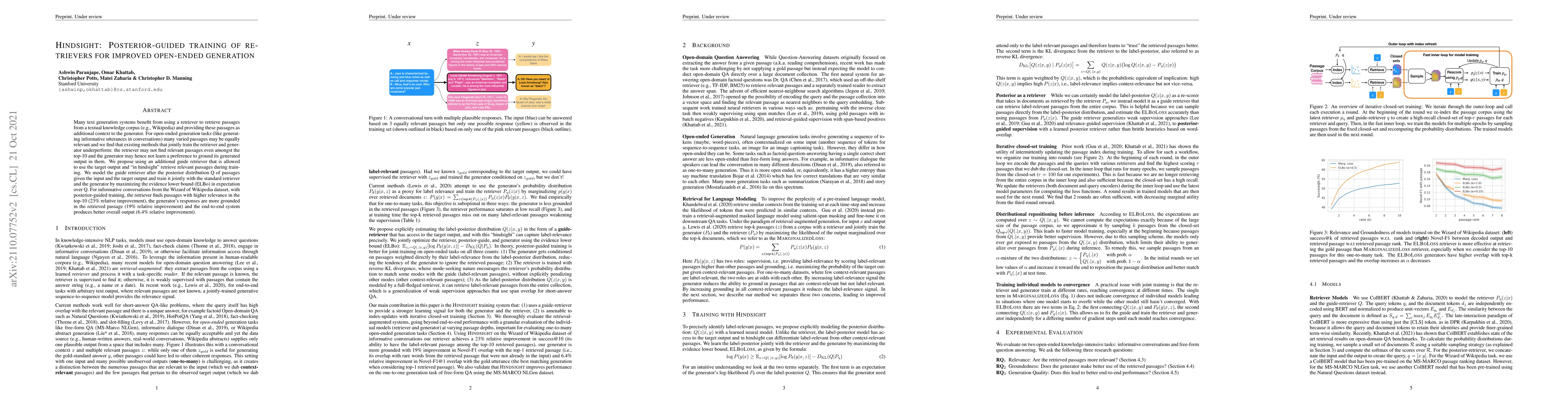 Hindsight introduces a guide retriever that improves supervision for both the retriever and generator in retrieval-augmented, open-ended generation tasks by allowing it to use the target output during training.