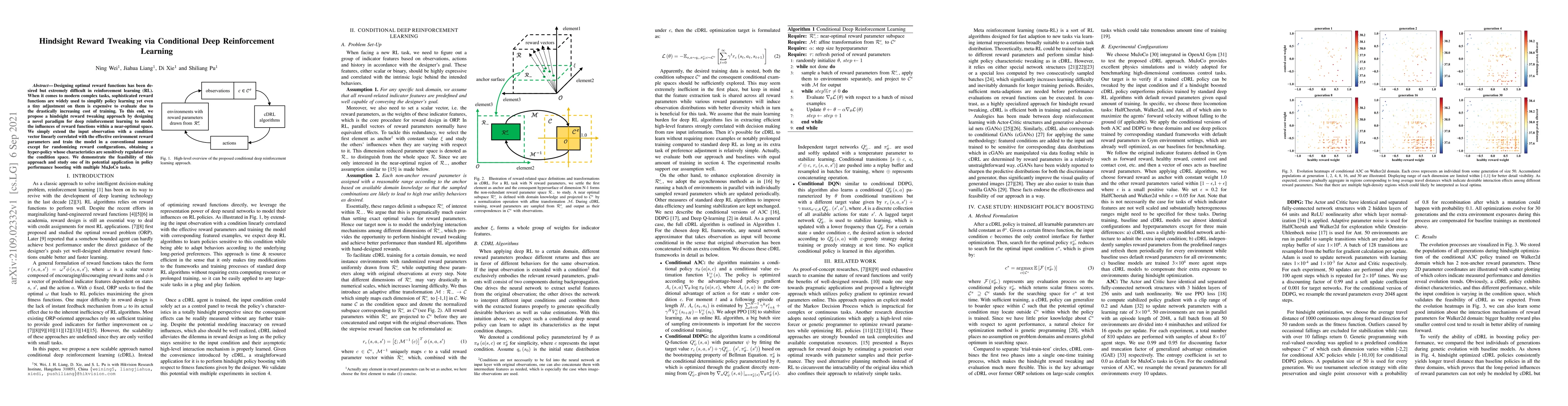 This paper proposes a hindsight reward tweaking method using conditional deep reinforcement learning to simplify the evaluation of reward function adjustments in complex tasks. The method extends observations with a condition vector correlated to reward parameters, enabling training of a hyper-policy that adapts to various reward configurations, demonstrated through improved policy performance in multiple MuJoCo tasks.