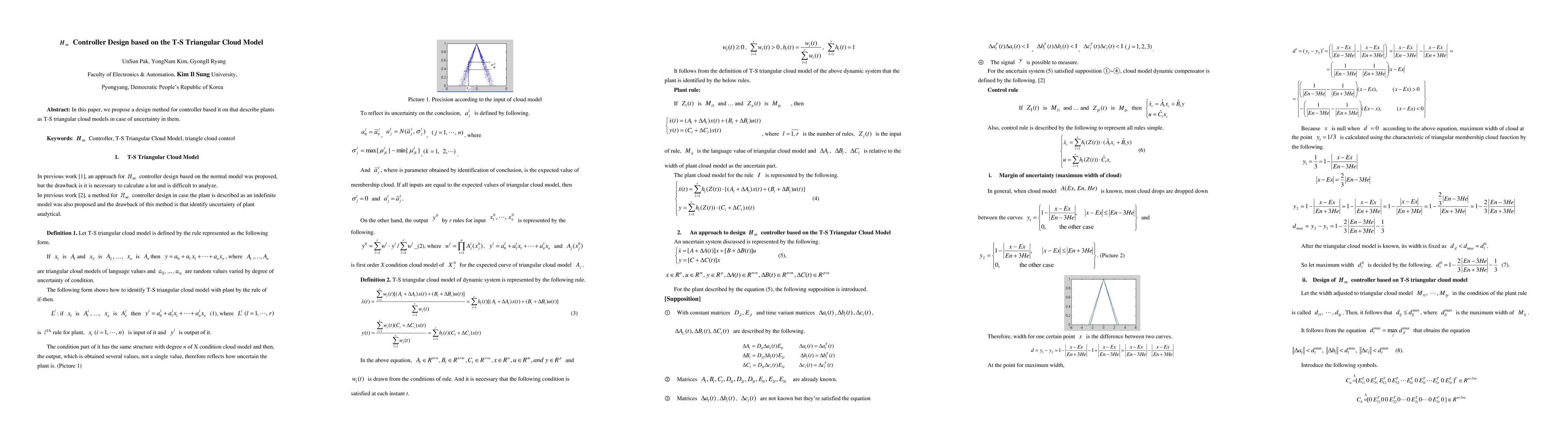 This paper proposes a controller design method based on T-S triangular cloud models for handling uncertainty in plants, offering a new approach to control systems under incomplete or uncertain knowledge.