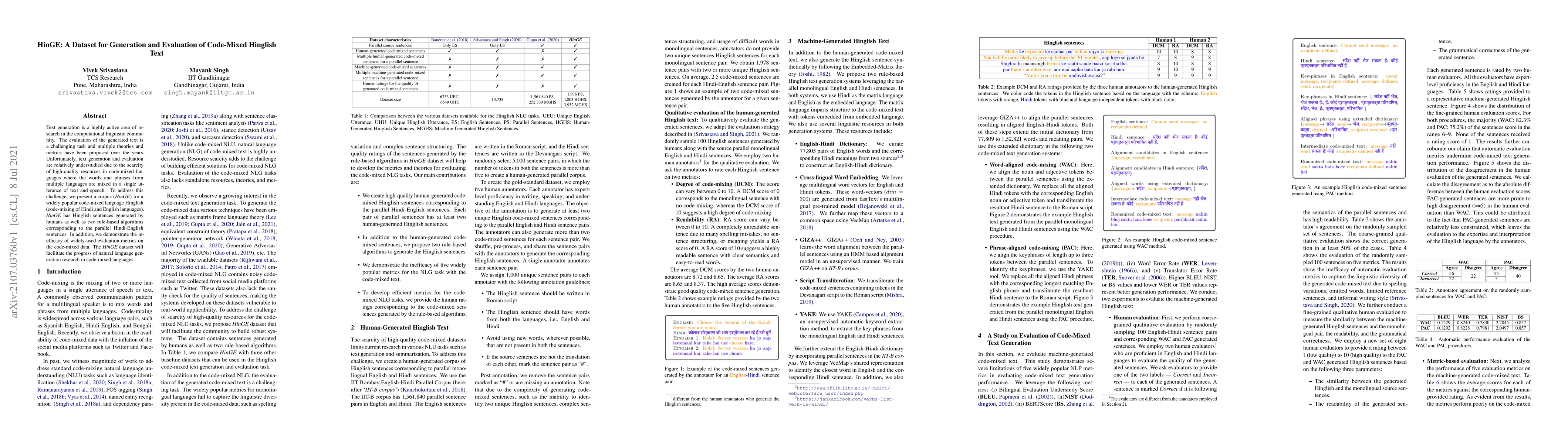 The HinGE dataset provides Hinglish sentences generated by humans and algorithms, aiming to address the scarcity of resources for code-mixed language research. It also highlights the limitations of existing evaluation metrics for such data, thereby facilitating advancements in natural language generation in code-mixed languages.
