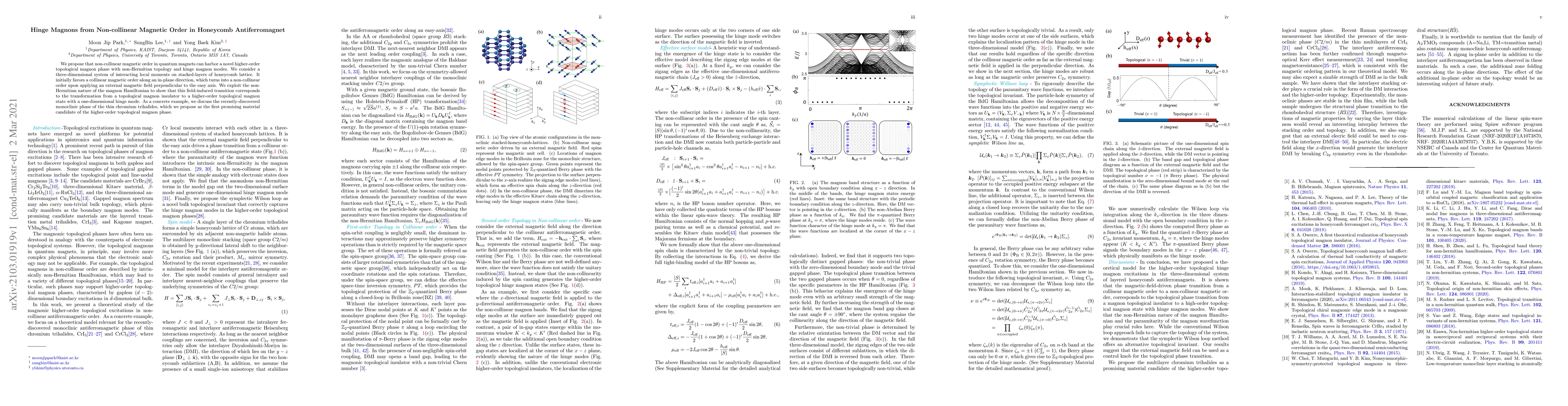 We propose that non-collinear magnetic order in quantum magnets can harbor a novel higher-order topological magnon phase with non-Hermitian topology and hinge magnon modes. We consider a three-dimensional system of interacting local moments on stacked-layers of honeycomb lattice. It initially favors a collinear magnetic order along an in-plane direction, which turns into a non-collinear order upon applying an external magnetic field perpendicular to the easy axis. We exploit the non-Hermitian nature of the magnon Hamiltonian to show that this field-induced transition corresponds to the transformation from a topological magnon insulator to a higher-order topological magnon state with a one-dimensional hinge mode. As a concrete example, we discuss the recently-discovered monoclinic phase of the thin chromium trihalides, which we propose as the first promising material candidate of the higher-order topological magnon phase.
