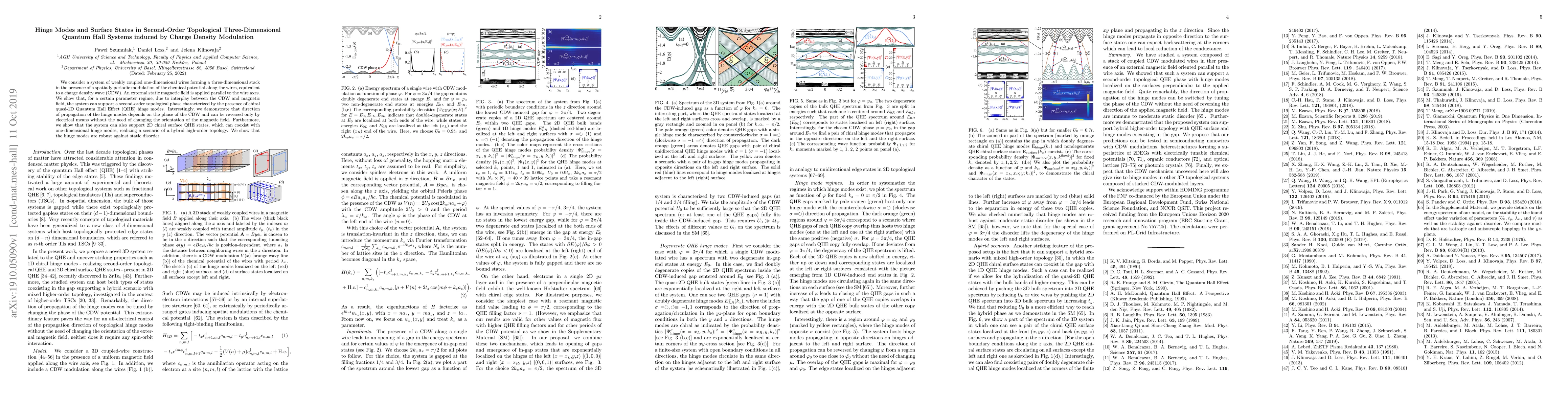 We consider a system of weakly coupled one-dimensional wires forming a three-dimensional stack in the presence of a spatially periodic modulation of the chemical potential along the wires, equivalent to a charge density wave (CDW). An external static magnetic field is applied parallel to the wire axes. We show that, for a certain parameter regime, due to interplay between the CDW and magnetic field, the system can support a second-order topological phase characterized by the presence of chiral quasi-1D Quantum Hall Effect (QHE) hinge modes. Interestingly, we demonstrate that direction of propagation of the hinge modes depends on the phase of the CDW and can be reversed only by electrical means without the need of changing the orientation of the magnetic field. Furthermore, we show that the system can also support 2D chiral surface QHE states, which can coexist with one-dimensional hinge modes, realizing a scenario of a hybrid high-order topology. We show that the hinge modes are robust against static disorder.
