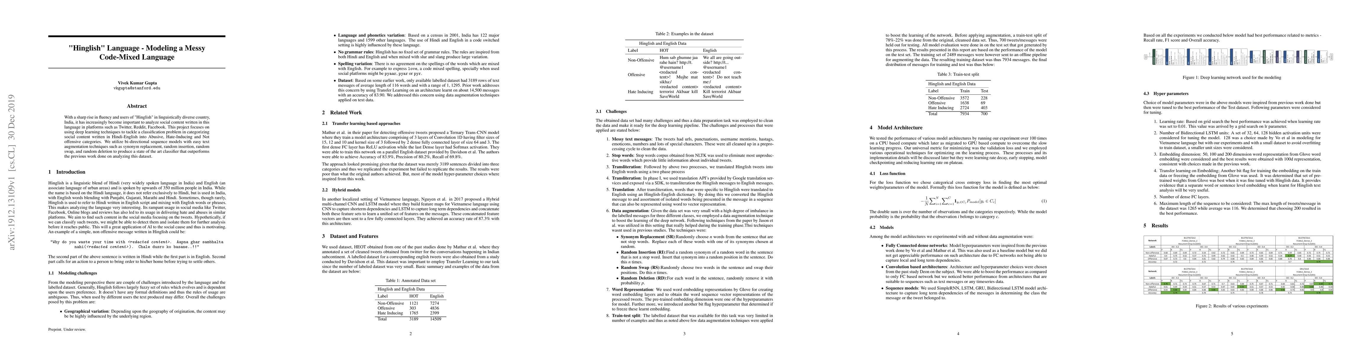 With a sharp rise in fluency and users of "Hinglish" in linguistically diverse country, India, it has increasingly become important to analyze social content written in this language in platforms such as Twitter, Reddit, Facebook. This project focuses on using deep learning techniques to tackle a classification problem in categorizing social content written in Hindi-English into Abusive, Hate-Inducing and Not offensive categories. We utilize bi-directional sequence models with easy text augmentation techniques such as synonym replacement, random insertion, random swap, and random deletion to produce a state of the art classifier that outperforms the previous work done on analyzing this dataset.