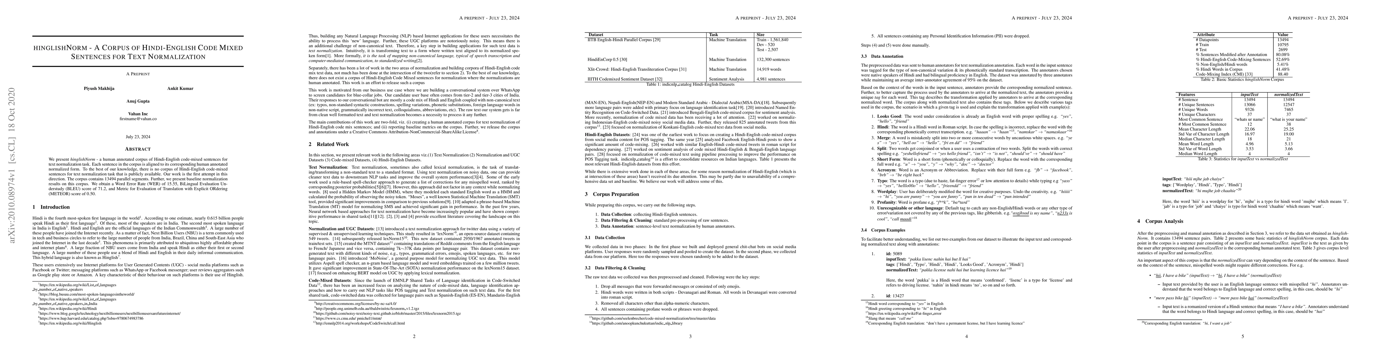 The hinglishNorm corpus presents a collection of 13,494 human-annotated Hindi-English code-mixed sentences aligned with their normalized forms, serving text normalization tasks. Initial baseline results achieved a Word Error Rate (WER) of 15.55, a BLEU score of 71.2, and a METEOR score of 0.50.