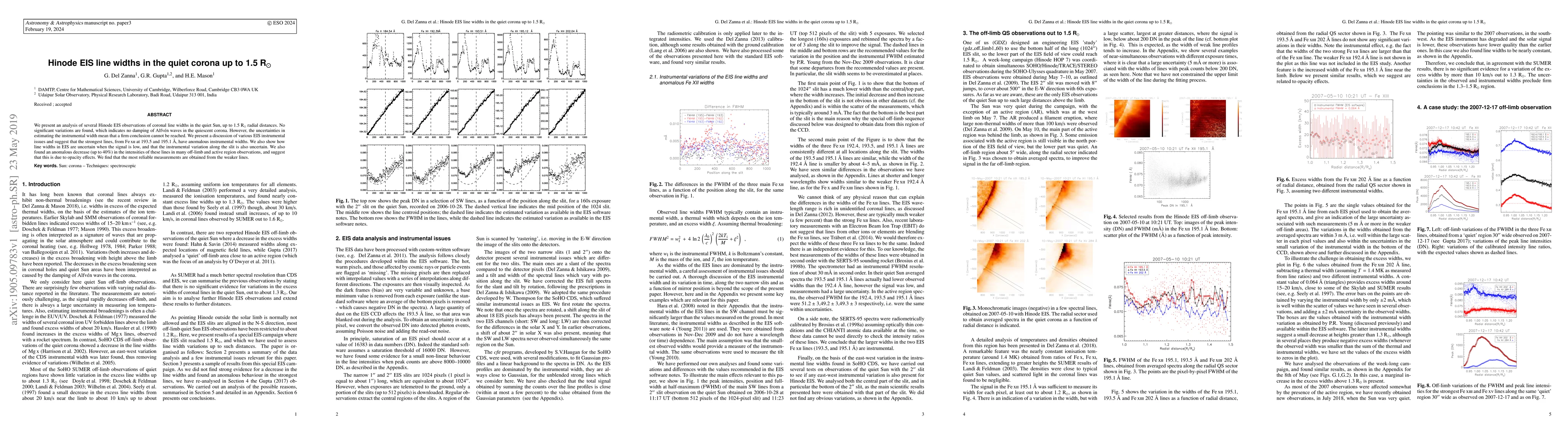 We present an analysis of several Hinode EIS observations of coronal line widths in the quiet Sun, up to 1.5 Rsun radial distances. No significant variations are found, which indicates no damping of Alfv\'en waves in the quiescent corona. However, the uncertainties in estimating the instrumental width mean that a firm conclusion cannot be reached. We present a discussion of various EIS instrumental issues and suggest that the strongest lines, from Fe XII at 193.5 and 195.1 A, have anomalous instrumental widths. We show how line widths in EIS are uncertain when the signal is low, and that the instrumental variation along the slit is also uncertain. We also found an anomalous decrease (up to 40%) in the intensities of these lines in many off-limb and active region observations, and suggest that this is due to opacity effects. We find that the most reliable measurements are obtained from the weaker lines.