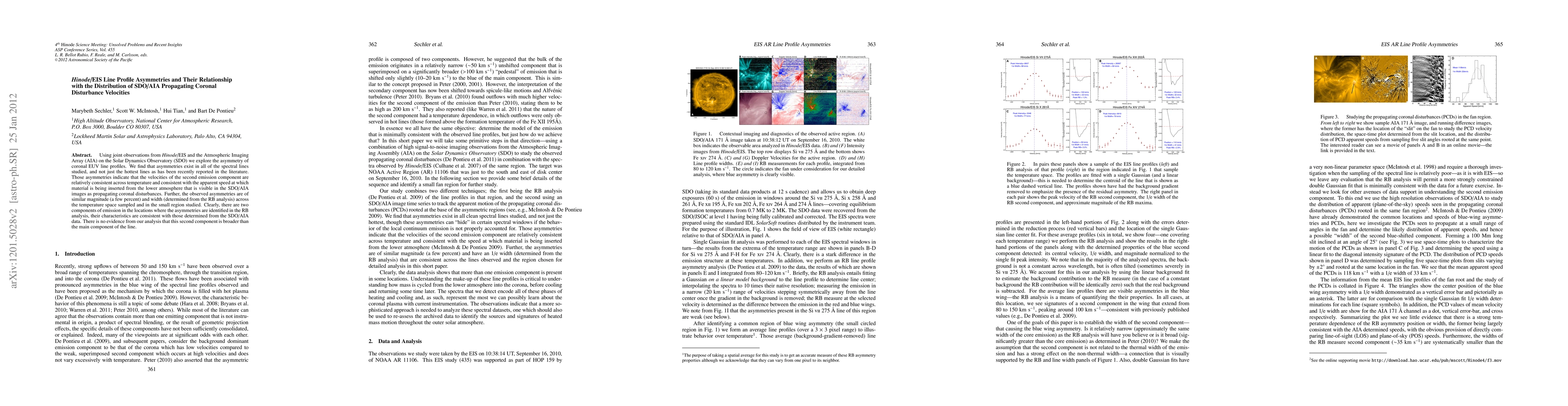 Using joint observations from Hinode/EIS and the Atmospheric Imaging Array (AIA) on the Solar Dynamics Observatory we explore the asymmetry of coronal EUV line profiles. We find that asymmetries exist in all of the spectral lines studied, and not just the hottest lines as has been recently reported in the literature. Those asymmetries indicate that the velocities of the second emission component are relatively consistent across temperature and consistent with the apparent speed at which material is being inserted from the lower atmosphere that is visible in the SDO/AIA images as propagating coronal disturbances. Further, the observed asymmetries are of similar magnitude (a few %) and width (determined from the RB analysis) across the temperature space sampled and in the small region studied. Clearly, there are two components of emission in the locations where the asymmetries are identified in the RB analysis, their characteristics are consistent with those determined from the SDO/AIA data. There is no evidence from our analysis that this second component is broader than the main component of the line.