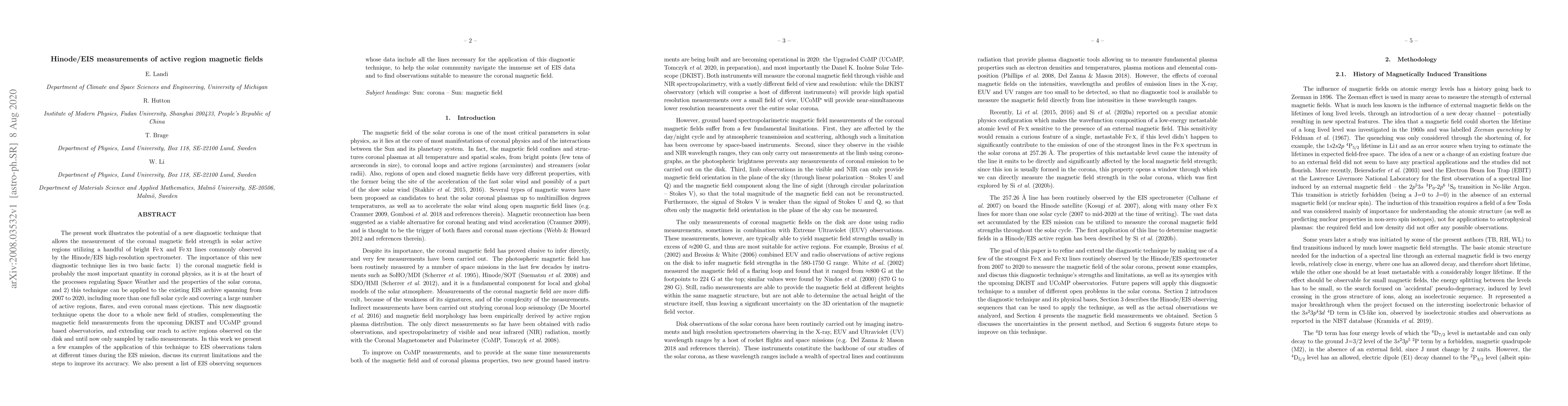 This paper introduces a new diagnostic technique for measuring coronal magnetic fields in solar active regions using Hinode/EIS spectrometer data, highlighting its significance for understanding space weather and solar corona properties. The technique can analyze existing EIS data from 2007 to 2020, offering a comprehensive approach to studying active regions and flares.