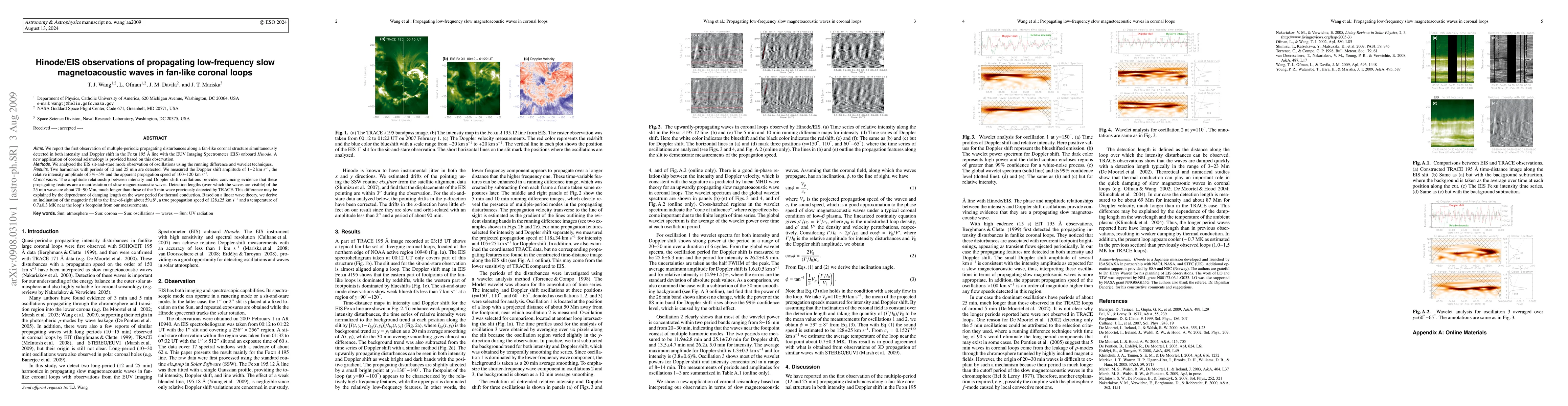 We report the first observation of multiple-periodic propagating disturbances along a fan-like coronal structure simultaneously detected in both intensity and Doppler shift in the Fe XII 195 A line with the EUV Imaging Spectrometer (EIS) onboard Hinode. A new application of coronal seismology is provided based on this observation. We analyzed the EIS sit-and-stare mode observation of oscillations using the running difference and wavelet techniques. Two harmonics with periods of 12 and 25 min are detected. We measured the Doppler shift amplitude of 1-2 km/s, the relative intensity amplitude of 3%-5% and the apparent propagation speed of 100-120 km/s. The amplitude relationship between intensity and Doppler shift oscillations provides convincing evidence that these propagating features are a manifestation of slow magnetoacoustic waves. Detection lengths (over which the waves are visible) of the 25 min wave are about 70-90 Mm, much longer than those of the 5 min wave previously detected by TRACE. This difference may be explained by the dependence of damping length on the wave period for thermal conduction. Based on a linear wave theory, we derive an inclination of the magnetic field to the line-of-sight about 59$\pm$8 deg, a true propagation speed of 128$\pm$25 km/s and a temperature of 0.7$\pm$0.3 MK near the loop's footpoint from our measurements.