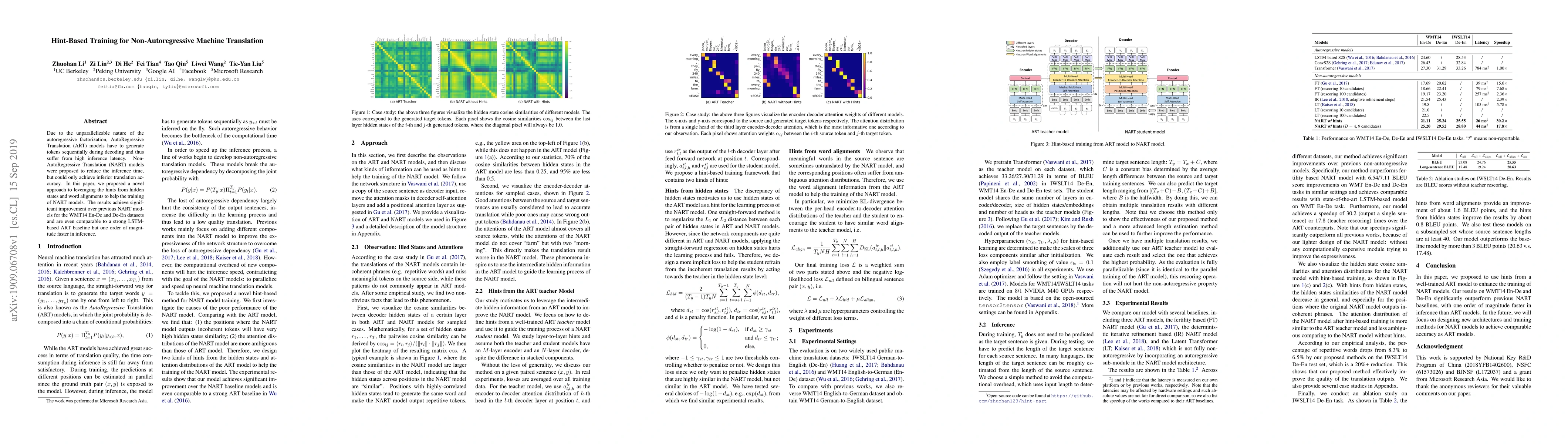 This paper proposes a hint-based training method for Non-Autoregressive Translation (NART) models, utilizing hidden states and word alignments to improve accuracy. The results show significant gains over previous NART models, achieving performance comparable to LSTM-based AutoRegressive Translation (ART) models while being an order of magnitude faster.